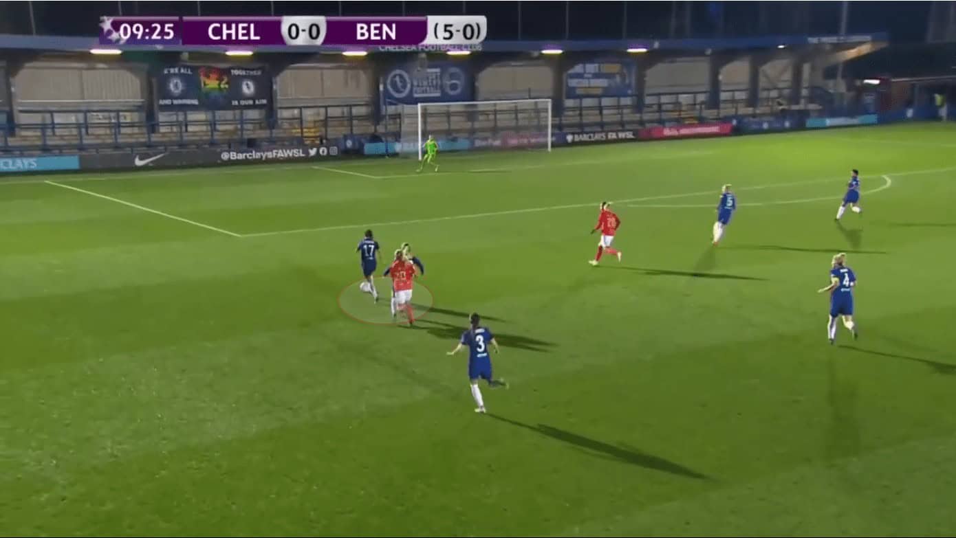 Here you can see Fleming receive possession in the half space with a number of Benfica players looking to close down the space. She’s in a good position but needs to progress the ball forward to get Chelsea into a more promising position. Her initial movement is to get the ball past the immediate player and does so with a great touch.