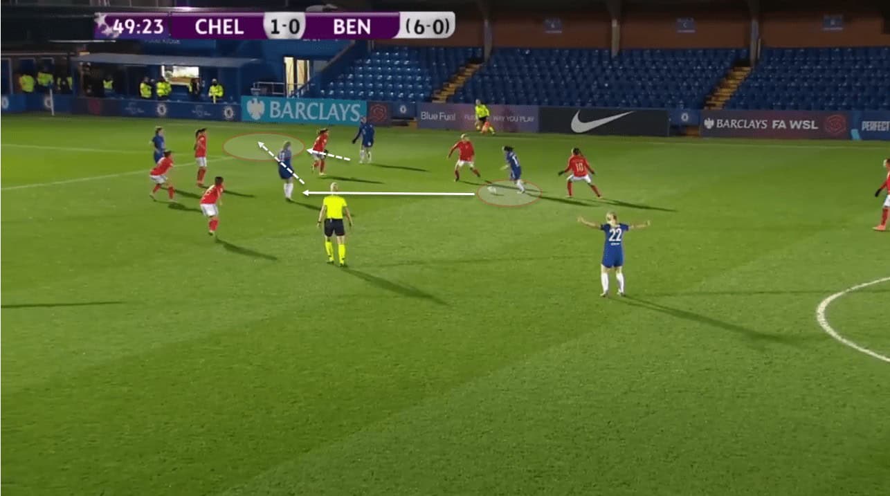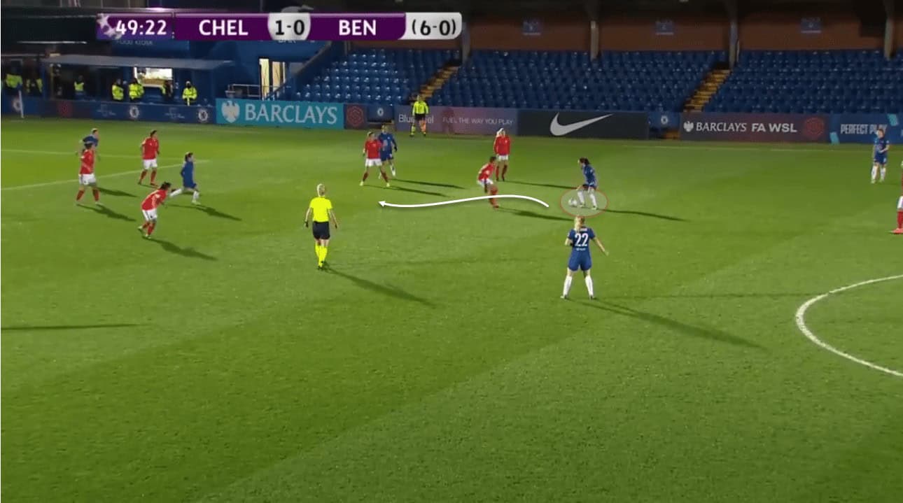 She is strong and aggressive when engaging in defensive duels. The Chelsea midfielder has this ability to be a nuisance will constantly press a midfielder until a pass is made or the player is dispossessed. She wants to get as close as possible to the ball receiver to limit the time the attacker has to make a decision. What’s incredibly apparent is her willingness to actively press and close down as much as possible.