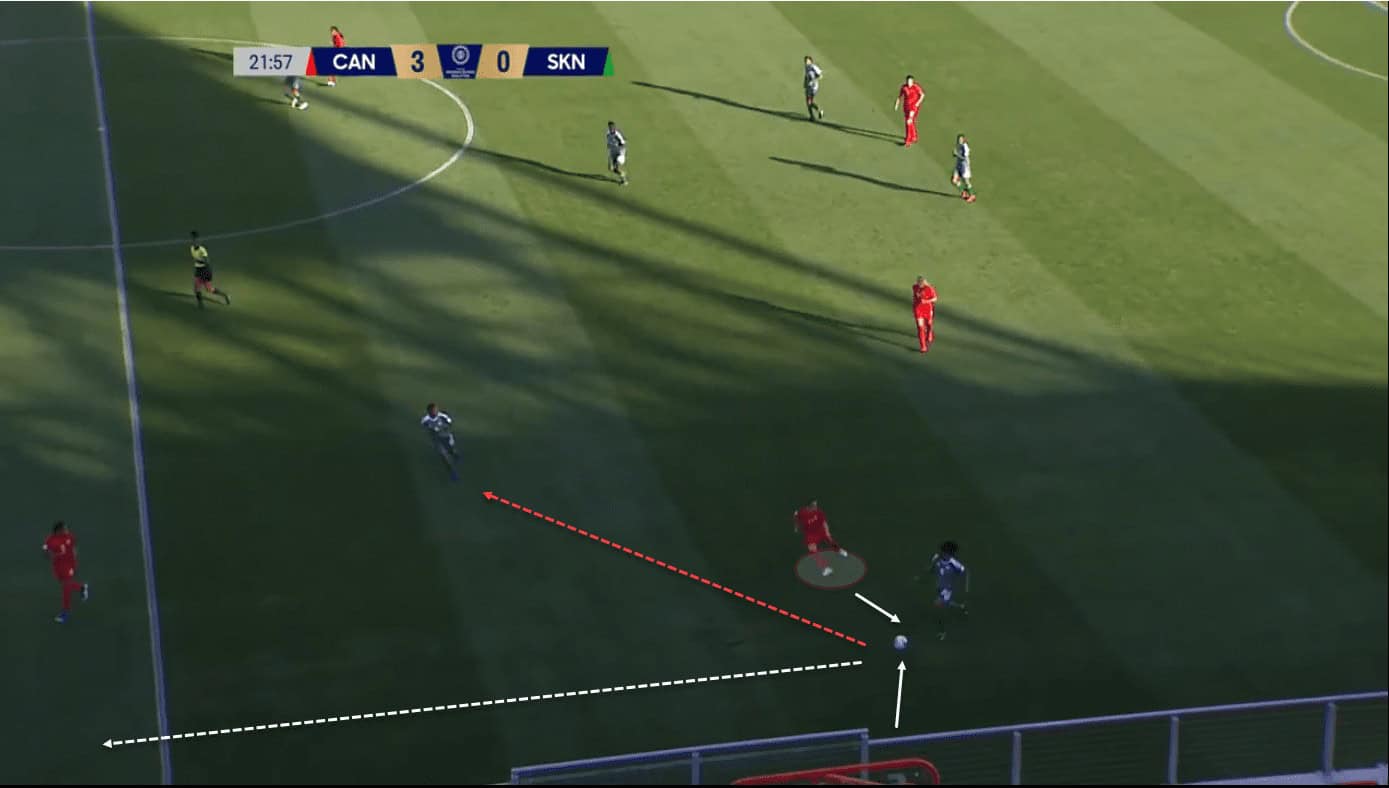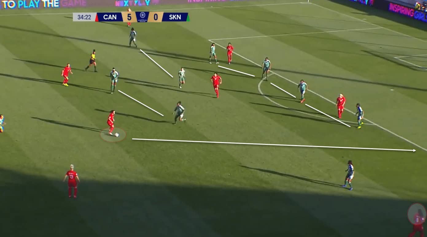 Here we see Fleming taking up possession in the half space for Canada against the United States Women’s National Team, where she is assessing her options. The American defence is holding a good line but her quick decision-making sees her spot a gap between the defence for the #16 to run onto breaking their shape. She also does this before Julie Ertz is able to close her down which makes her a very press resistant midfielder. Fleming isn’t afraid to take possession in contentious areas of the pitch and is always looking to progress the ball forward.