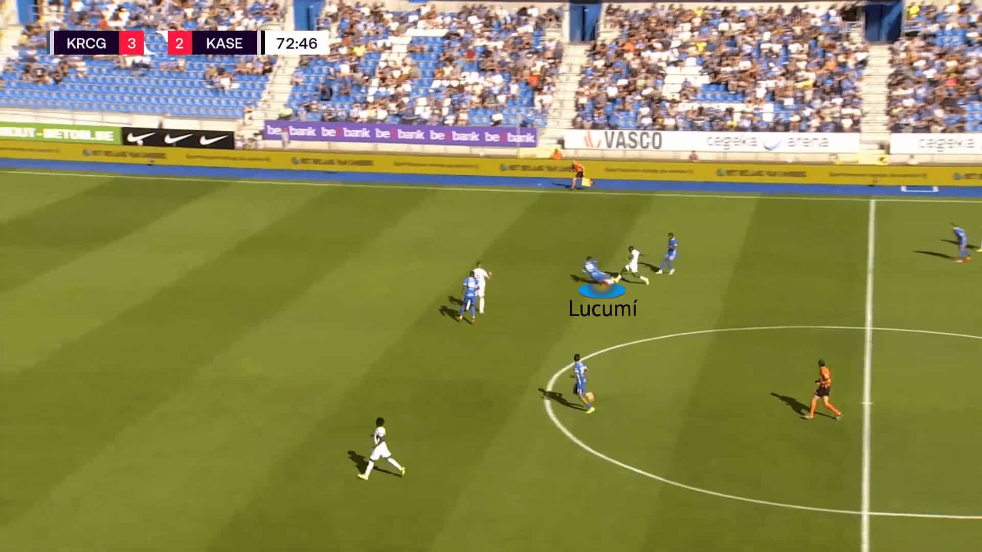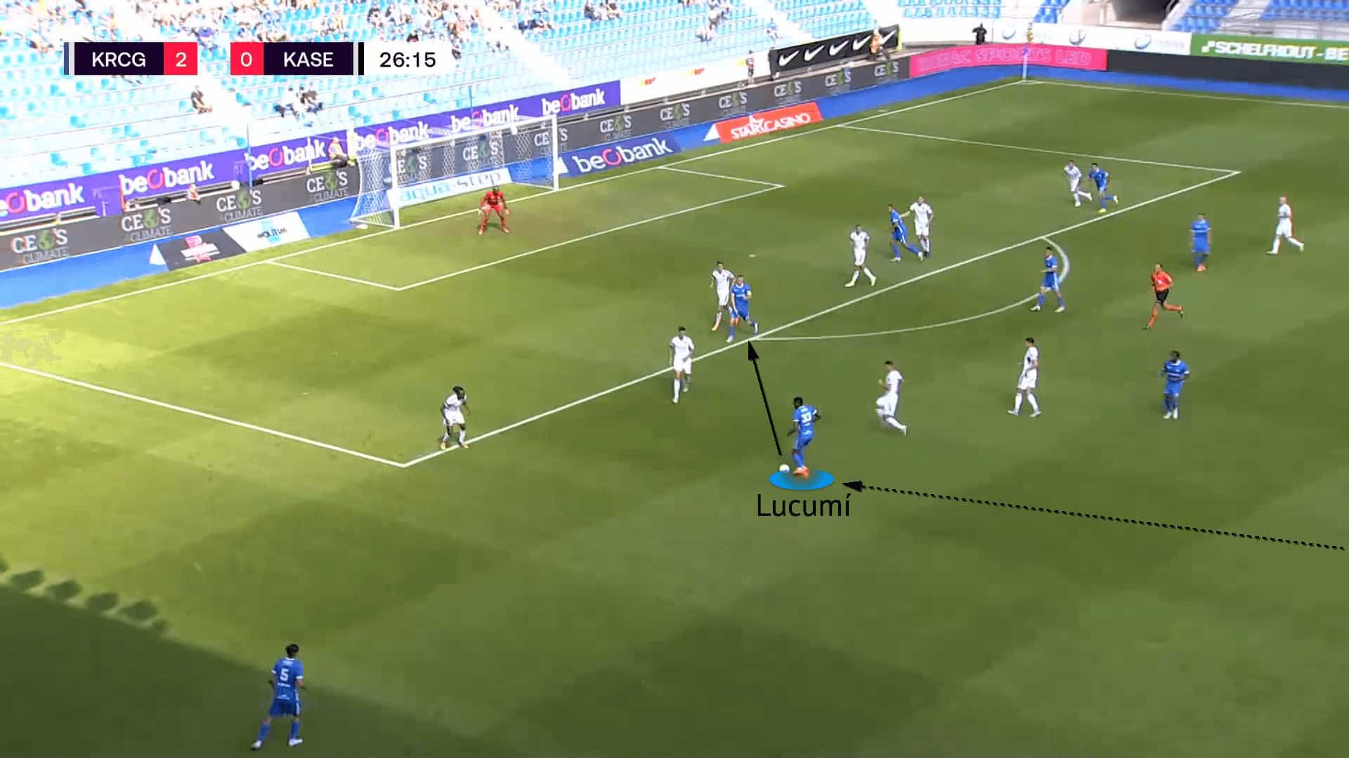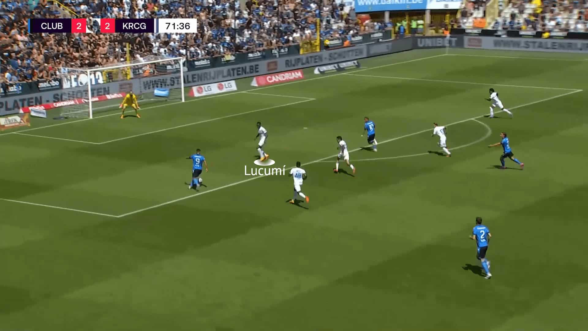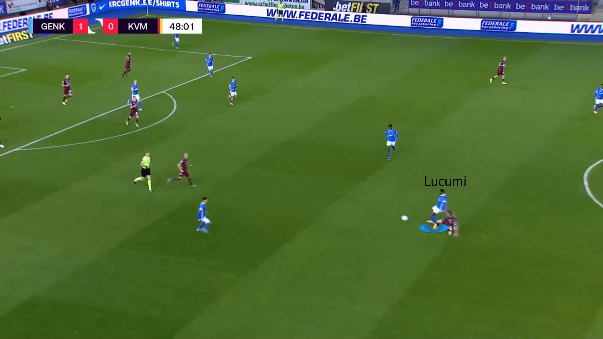 By switching play to Joseph Paintsil, Lucumí has accessed Genk’s right-side overload, allowing them to create a crossing opportunity.
