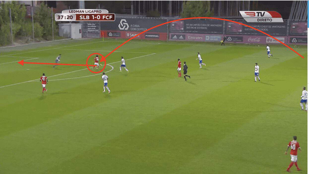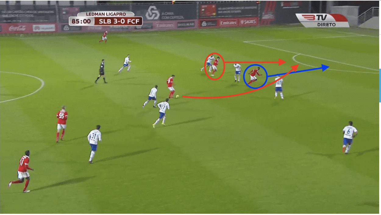 For his third goal against Famalicao, he uses the run of the central striker to ghost in behind the centre back to finish.