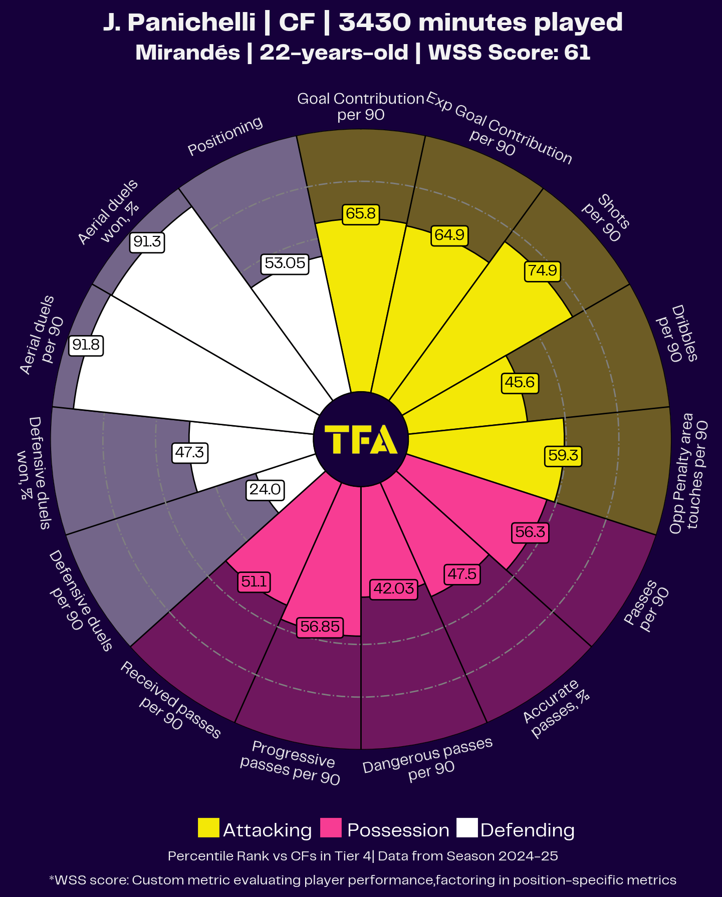 Outside of that goalscoring ability, Panichelli’s aerial ability, defensive contribution and hold-up play are key elements of the Argentinian’s game that make him valuable.
