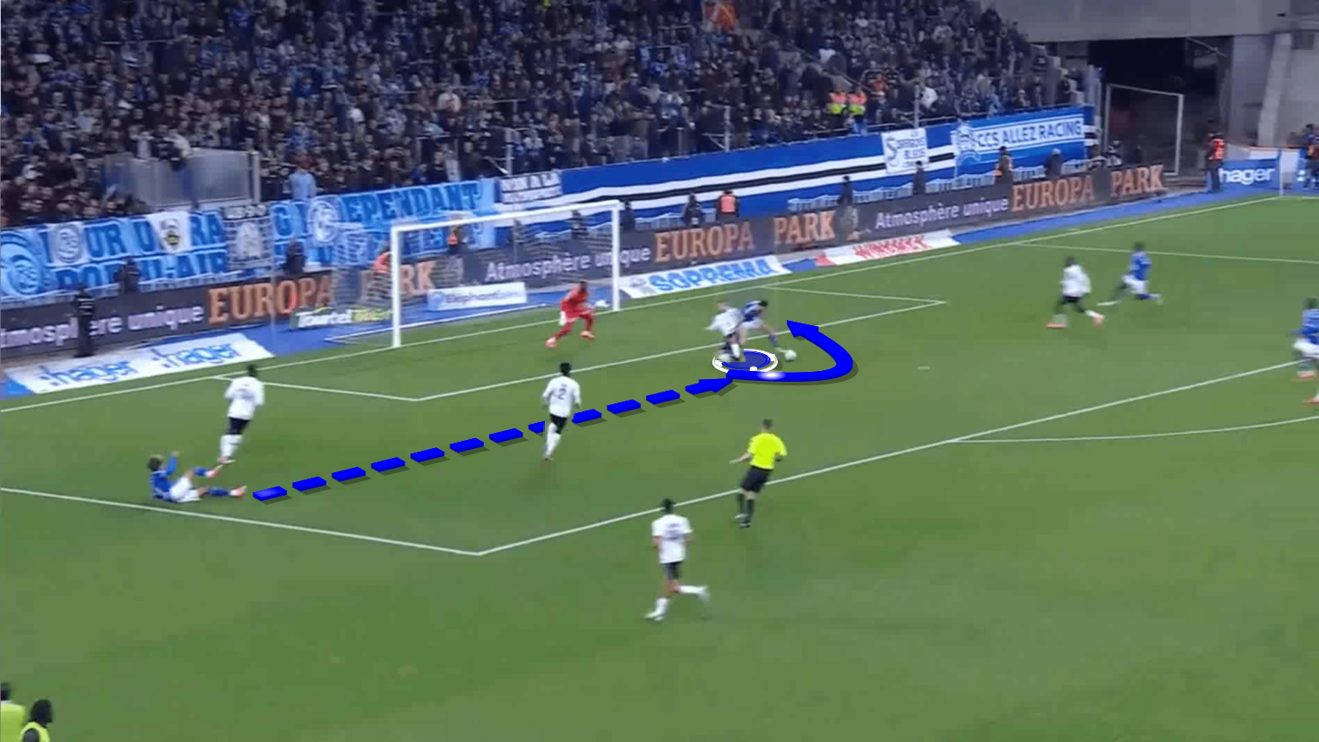 This clip below from a game Strasbourg ultimately lost away to Olympique Lyonnais 2-1 shows Joaquín Panichelli helping his team get into the lead and really encapsulates what we’re talking about when we say intelligent movement and high energy.