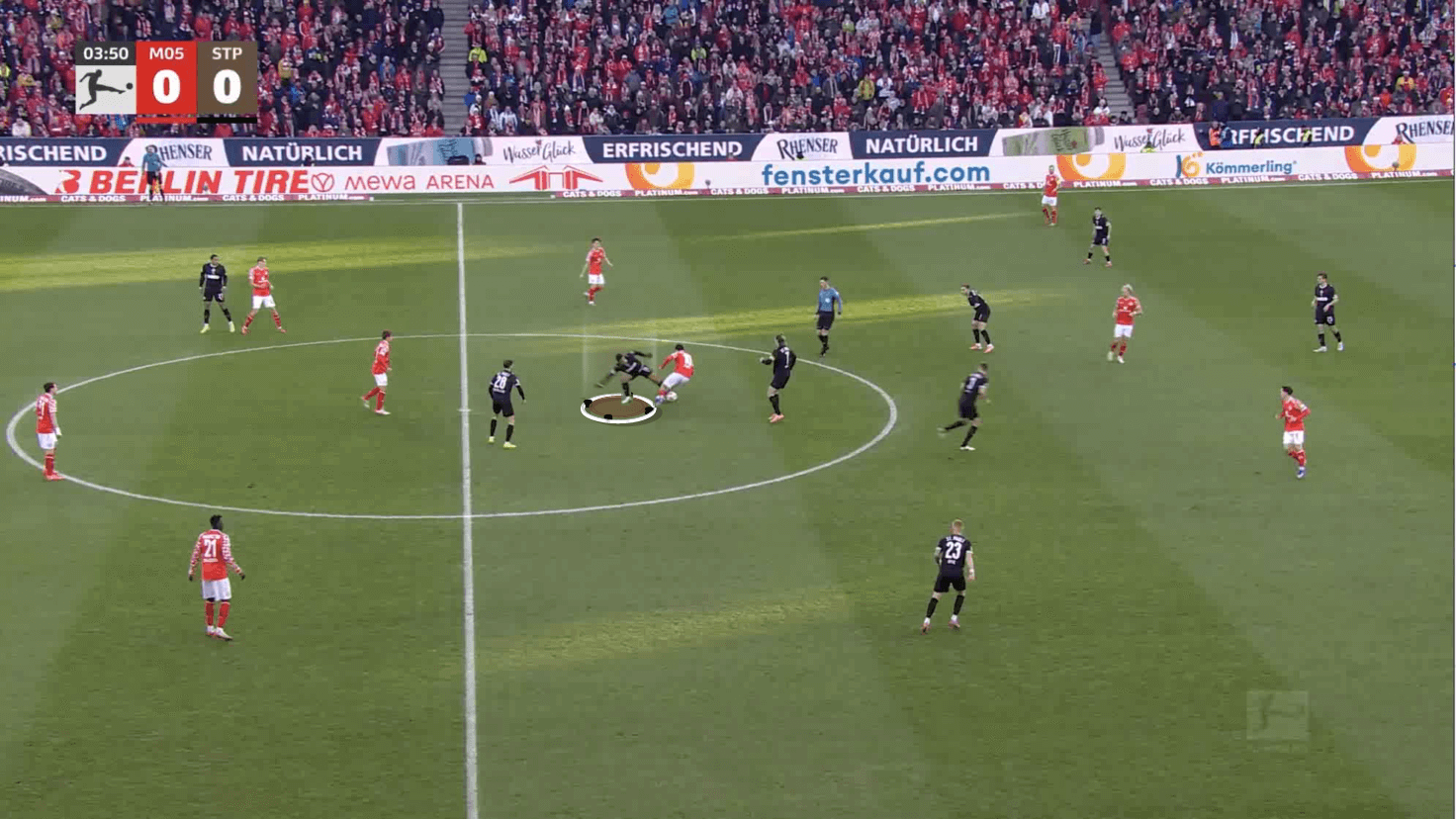 Here, Joel Chima Fujita just drops back slightly as the opponent tries to dribble out of pressure before making a decisive challenge to win possession in a strong position for St. Pauli to play a creative forward pass.