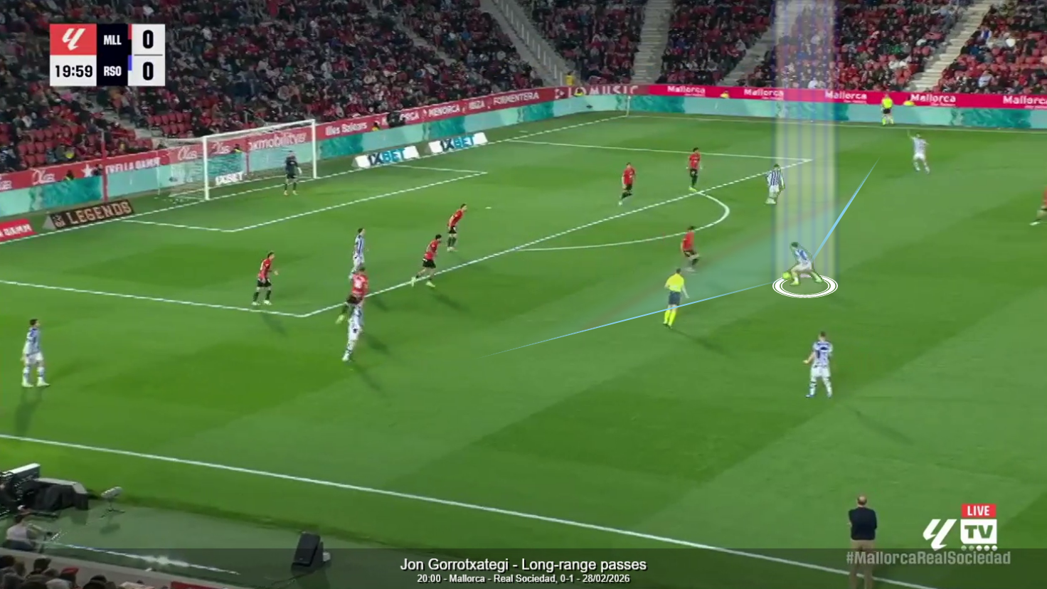 Once the pressure is broken, Gorrotxategi displays his expansive passing range by delivering a long-range diagonal switch to exploit the opponent’s weak side.