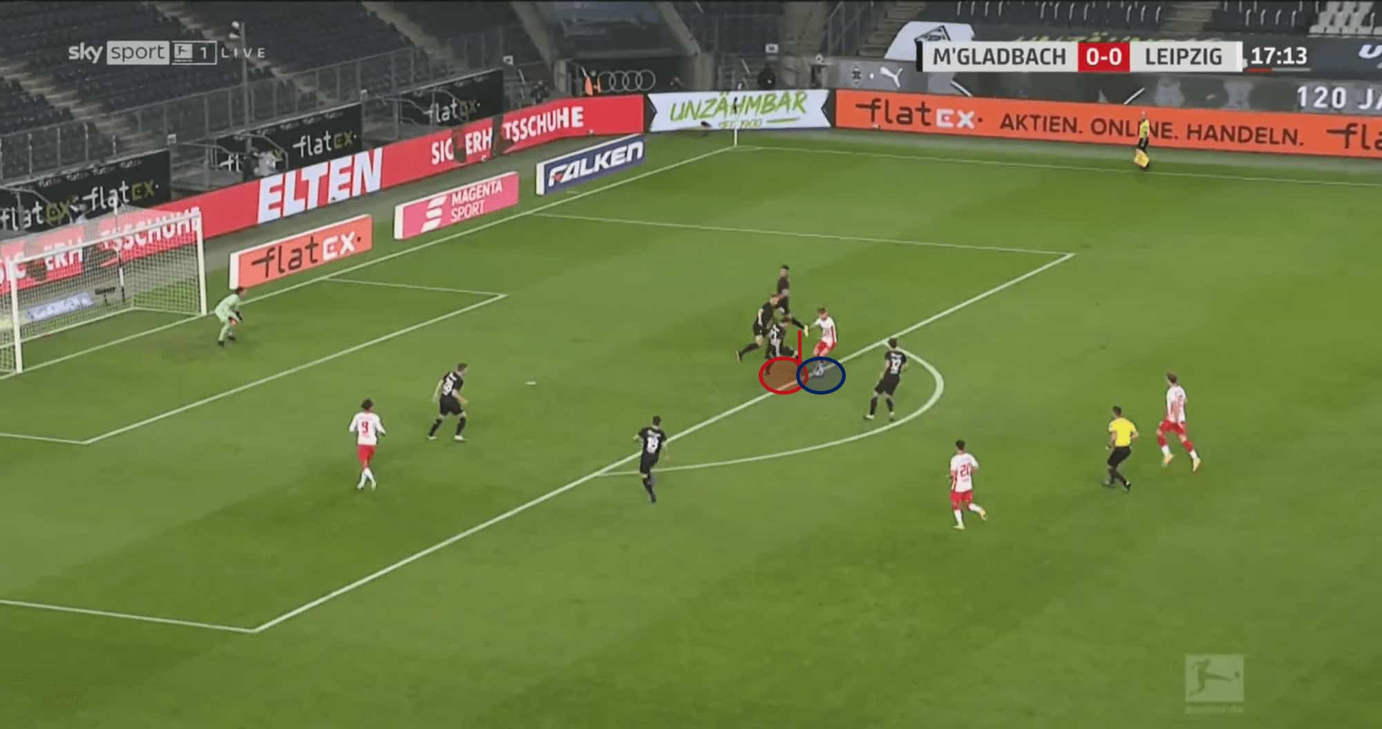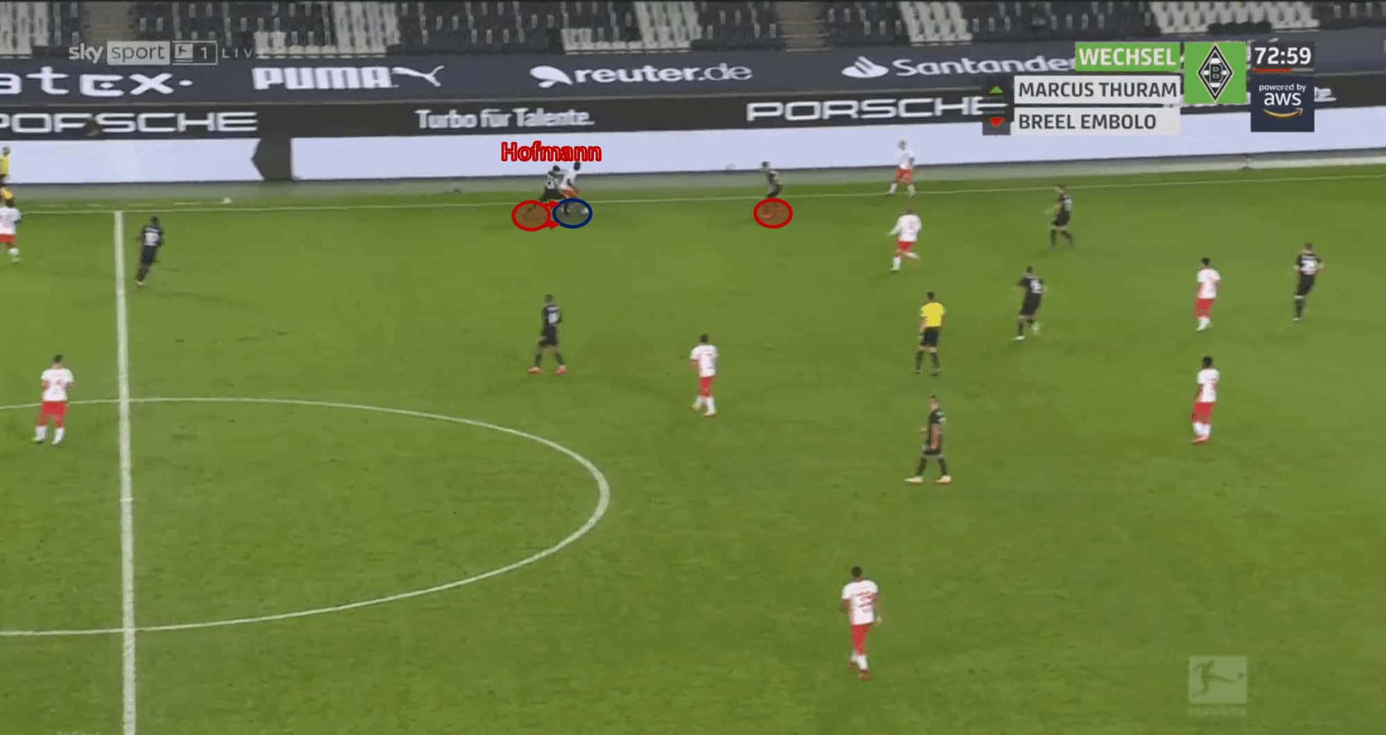 As a defensive midfielder against Leipzig, Hofmann was a proactive defender, who looks to get in the opponent’s vicinity to win the ball back, often forcing his opponent out wide. Gladbach prefer to force their opponent’s into wide zones, considering how narrow they operate, meaning they can protect valuable zones inside the penalty area with several bodies.