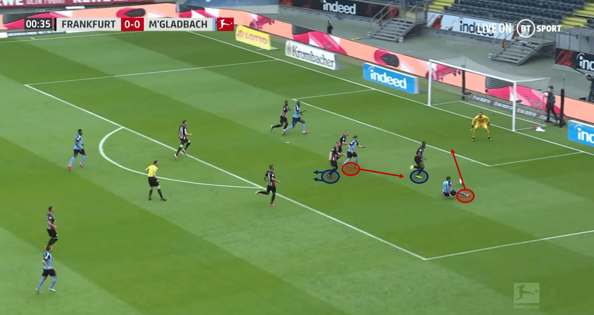 Here, Hofmann drives down the core of the Frankfurt defence and receives the ball in the penalty area.