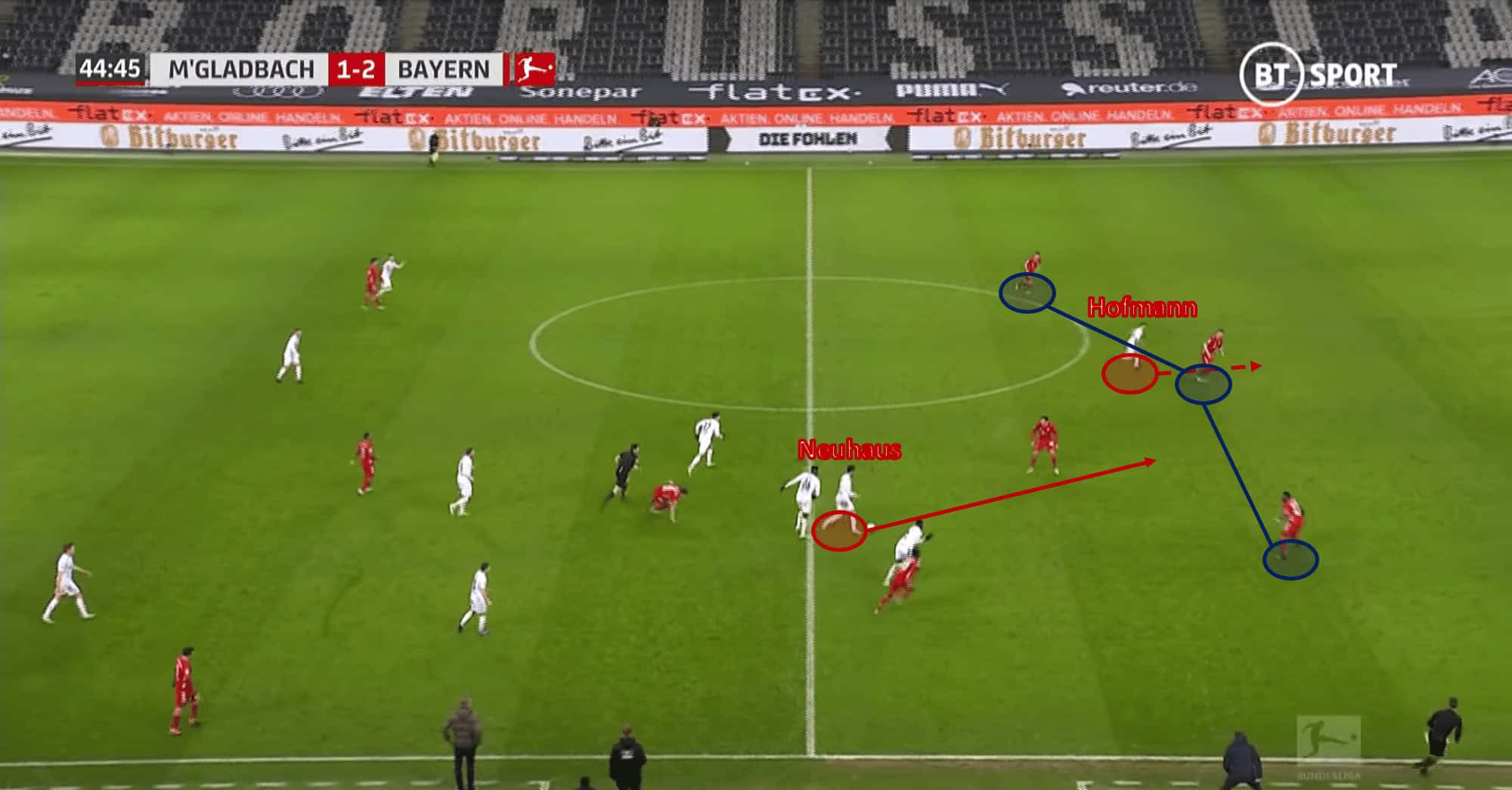 And he’s off – Neuhaus wins the ball back in midfield and Hofmann sprints behind Bayern’s high line.
