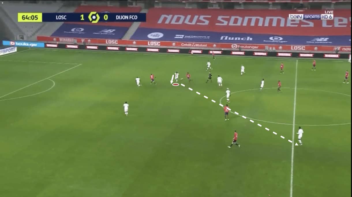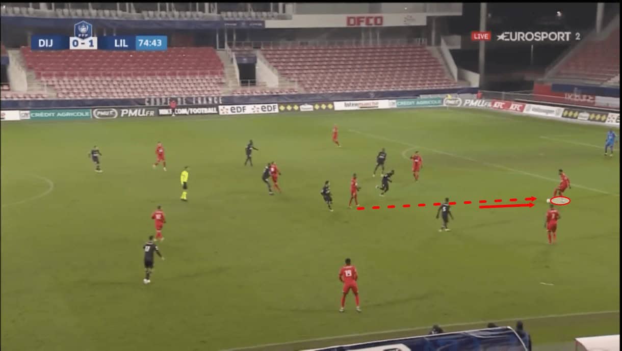 As the play moves on, Panzo ends up carrying the ball a considerable distance into the opposition half, almost into the final third. As he does so, he attracts pressure from more players and this allows the overlapping Dijon left-back to find some space out on the left-wing. As he makes his run, Panzo lifts the ball over the top for the left-back to run onto.
