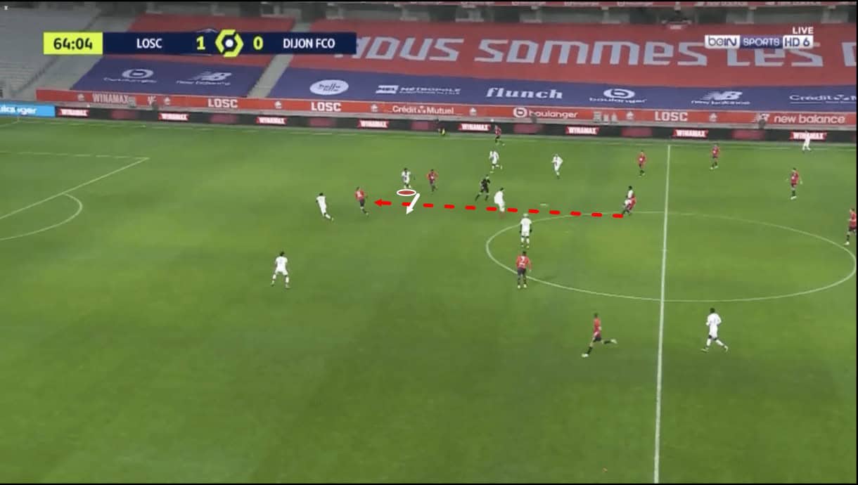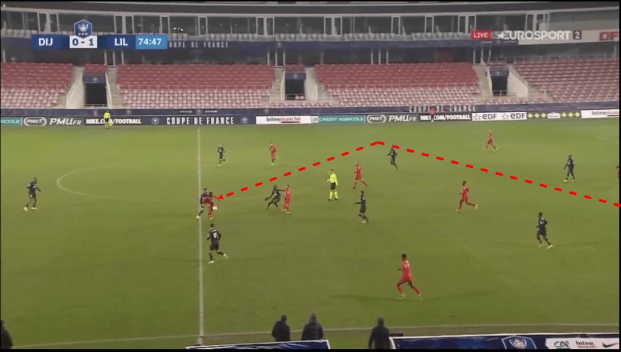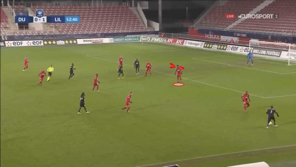 Panzo has also proven to be quite calm under pressure when playing out from the back. Just before this next image above was taken, Panzo received the ball from the right centre-back. As he controlled the pass, the Lille striker pressed him from the inside, preventing him from playing the ball back to the right centre-back or into central midfield.