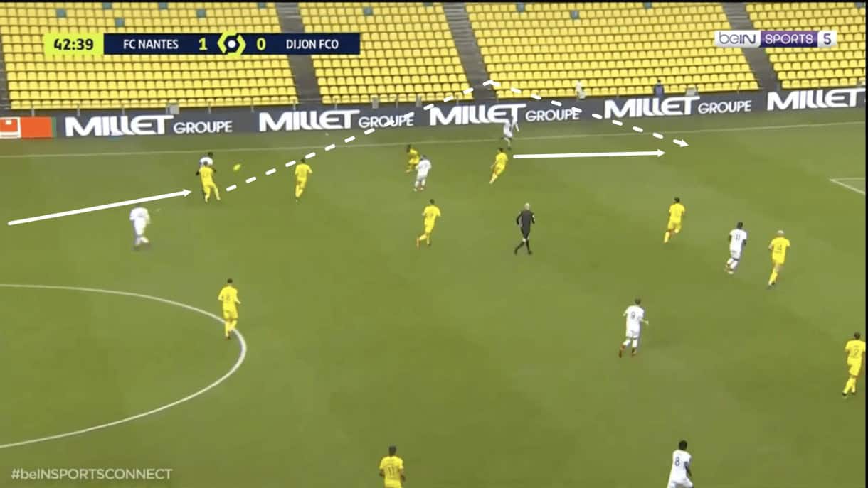 It’s fairly common to see Panzo pull off this particular pass when playing against a narrow side, as quickly switching the play like this can see the right-back take advantage of the space afforded to him by the opposition’s narrow structure to carry the ball forward for Dijon.