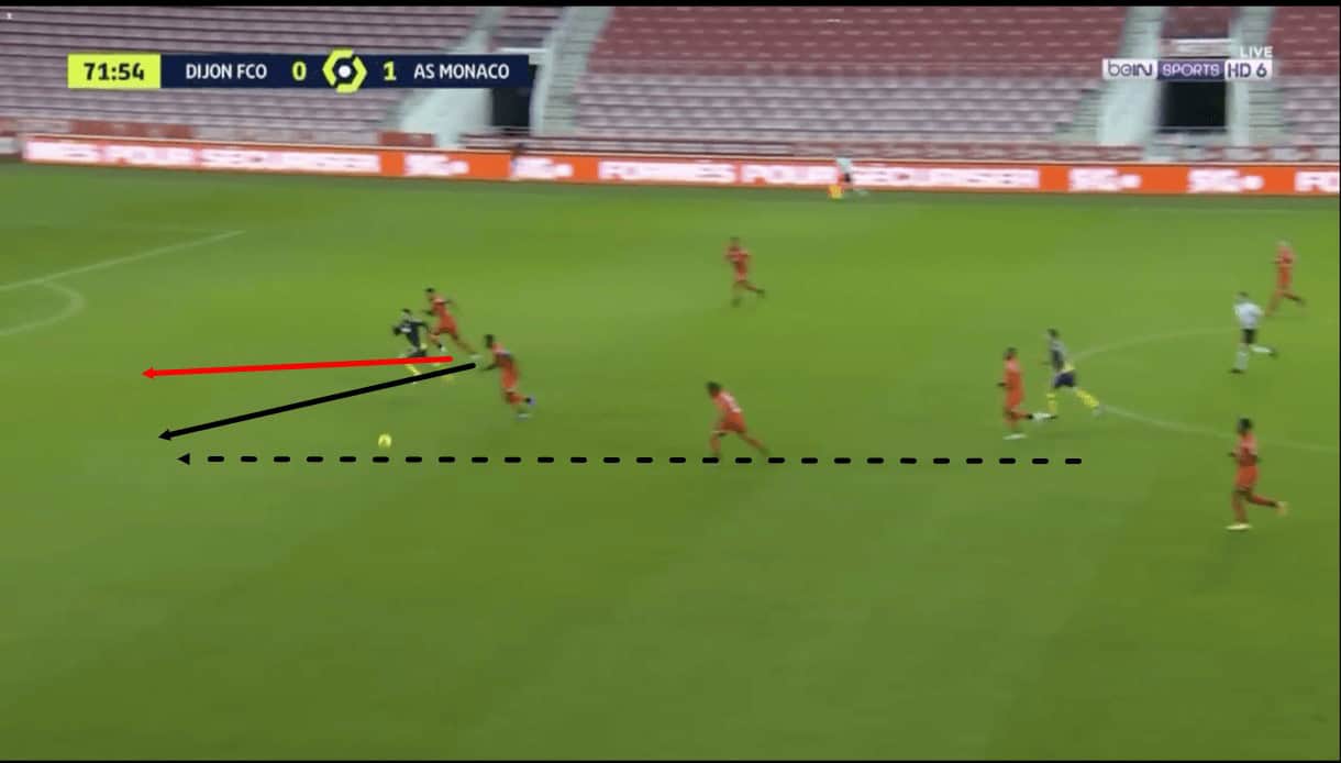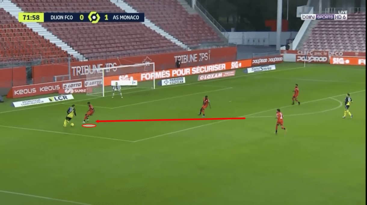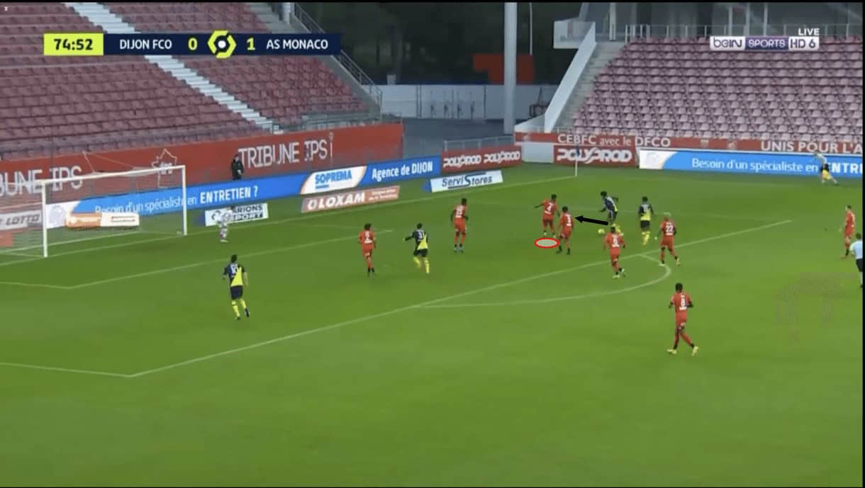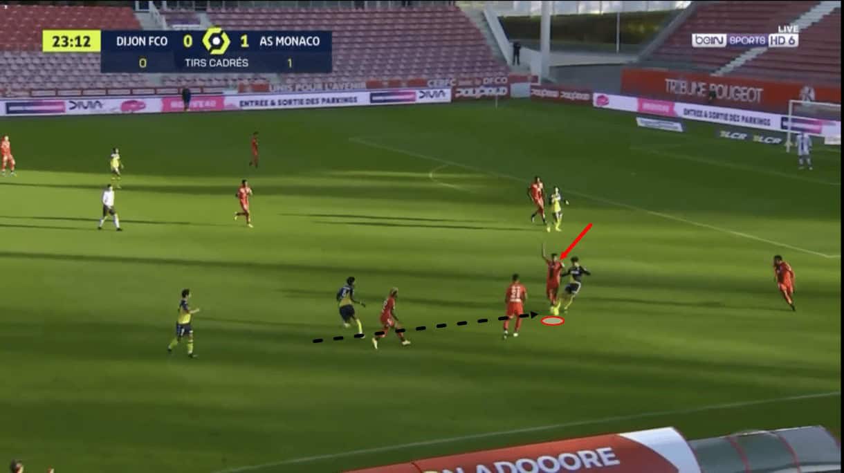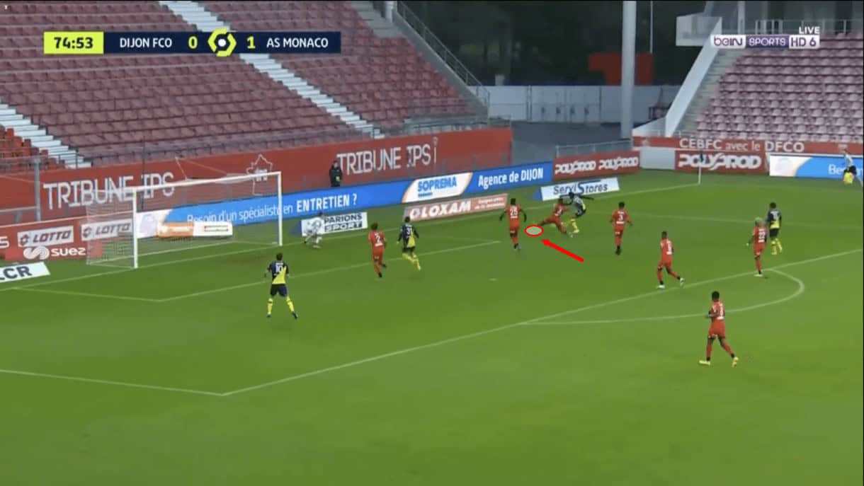 As this passage of play moves on, we see that Panzo was capable of stifling the attacker long enough that some of his teammates managed to get back and provide support and this led to the Monaco attack fizzling out and a Dijon counter-attack beginning.