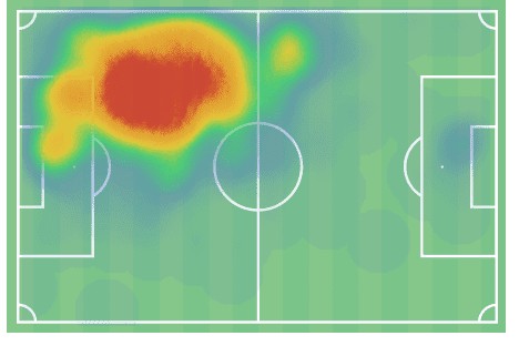This heatmap shows a considerable amount of colour out as far as the left sideline, which indicates that Panzo doesn’t just remain centrally, but also pushes out into wider positions at times.