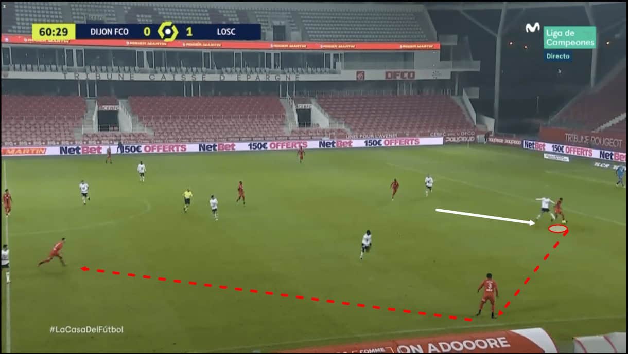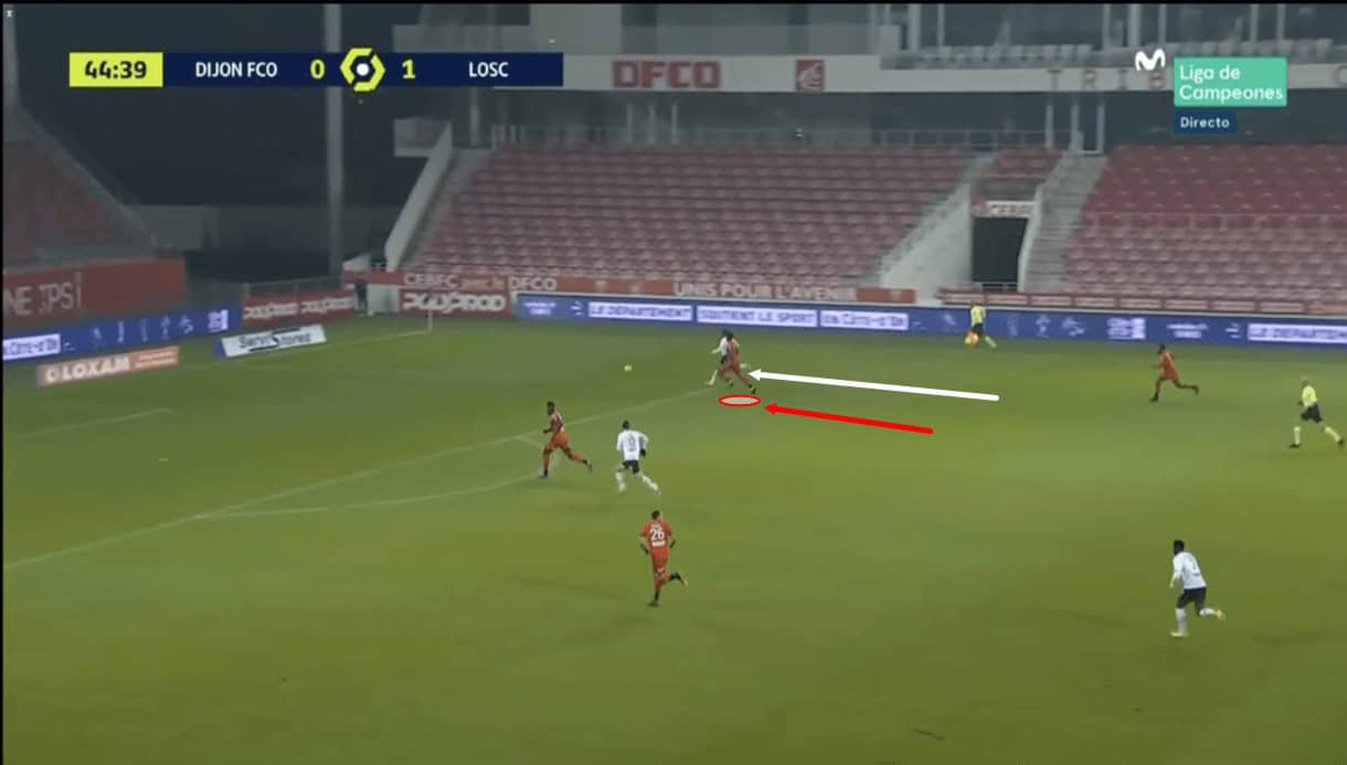 He did benefit from the fact that the ball was played down the wing, as opposed to straight through the centre of the pitch towards the goal on this particular occasion, as it prevented a 1v1 between the Lille attacker and Dijon’s goalkeeper from being created, however, had the ball been played towards the goal, this would likely have happened and there’s little that Panzo could’ve done about it as he’d have been beaten for pace, so this is an area of his game that can be exploited.