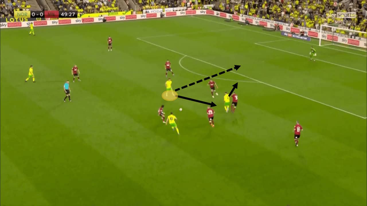 This season, over 70% of his minutes have been played as a ‘9’ in Norwich’s attack. In this campaign, the Canaries have used a 4-3-3 or a variation of this. This formation can lead to attacking isolation while playing as a solo striker. Sargent has adapted well and is able to get himself into games.