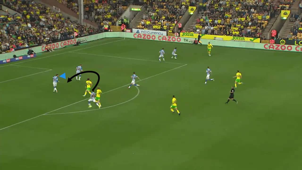 He looks to play the winger into the space behind, creating a goalscoring opportunity. He is comfortable in doing this and is clever in losing his marker. He chooses when to drop deep and times it well leading to a difficult decision for the defender. Do they go with him and come out of their defensive shape or stay and allow Sargent to turn?