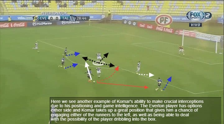 Komar uses his timing and reading of the game to win these duels rather than relying on physicality or brute force to simply bully opponents. Nevertheless, he is proactive and aggressive when attacking the ball, as shown by the example below.