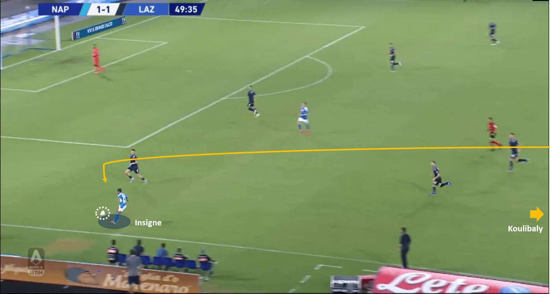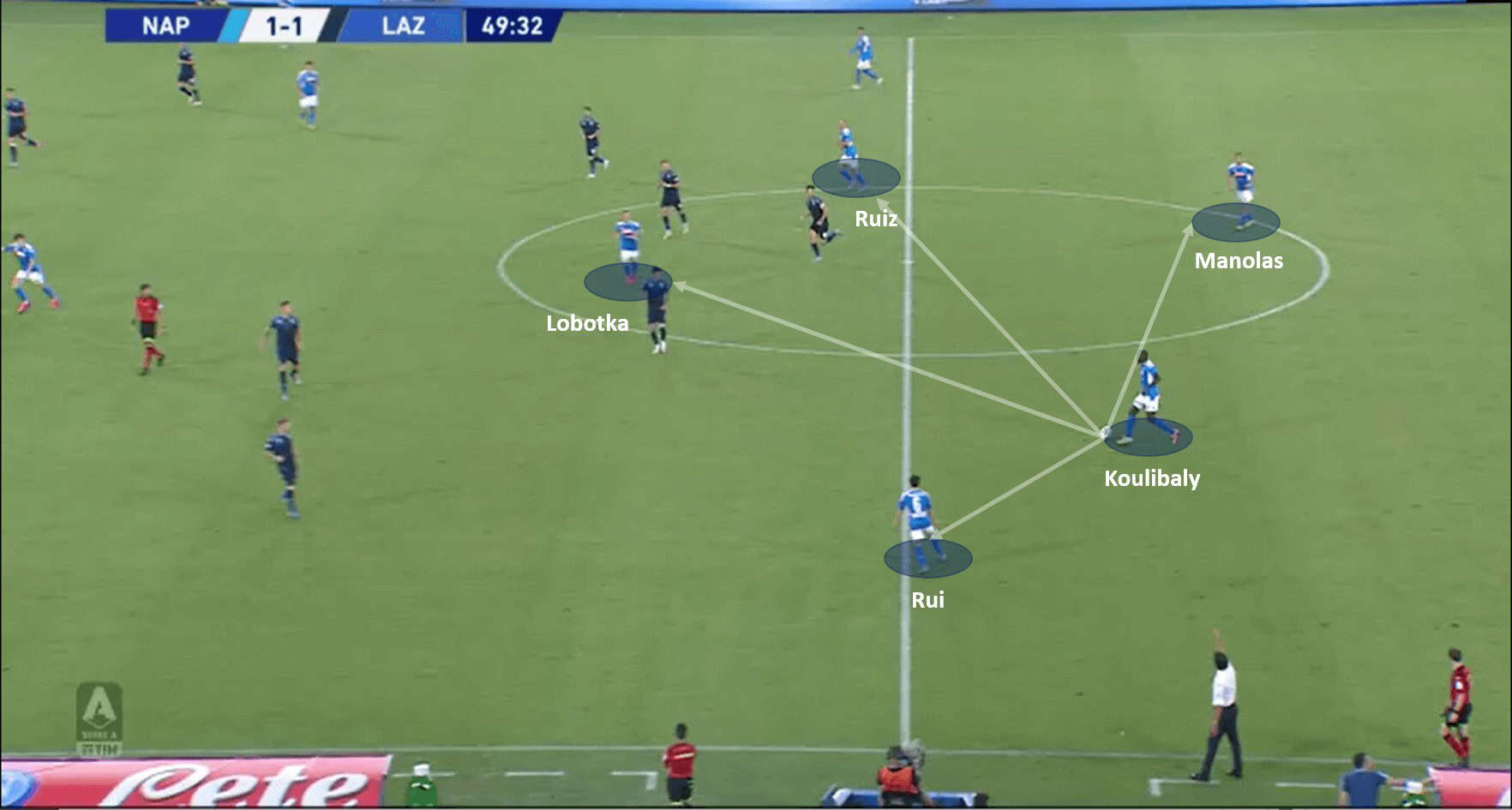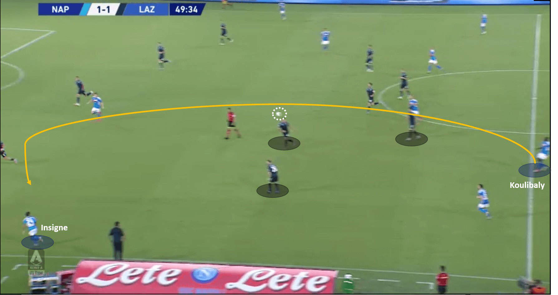 The first instance for the analysis, is from the game Napoli vs Lazio. Koulibaly has at least four safe passing options, but instead opts to play a long attacking passes, to unlock Lazio’s shape. This long attacking pass adds a great deal of intent to Napoli’s build-up tactics. Below are the images to support the analysis.
