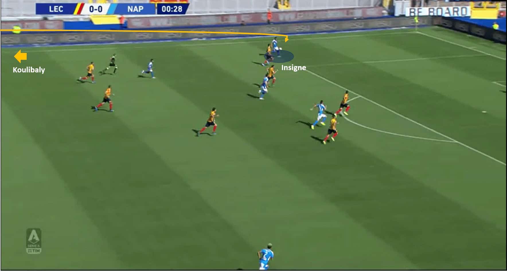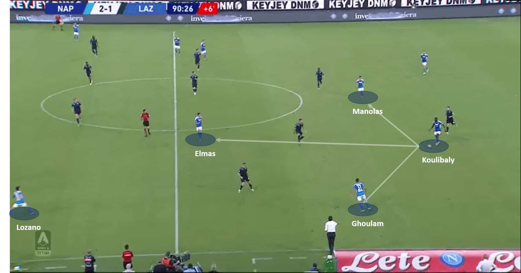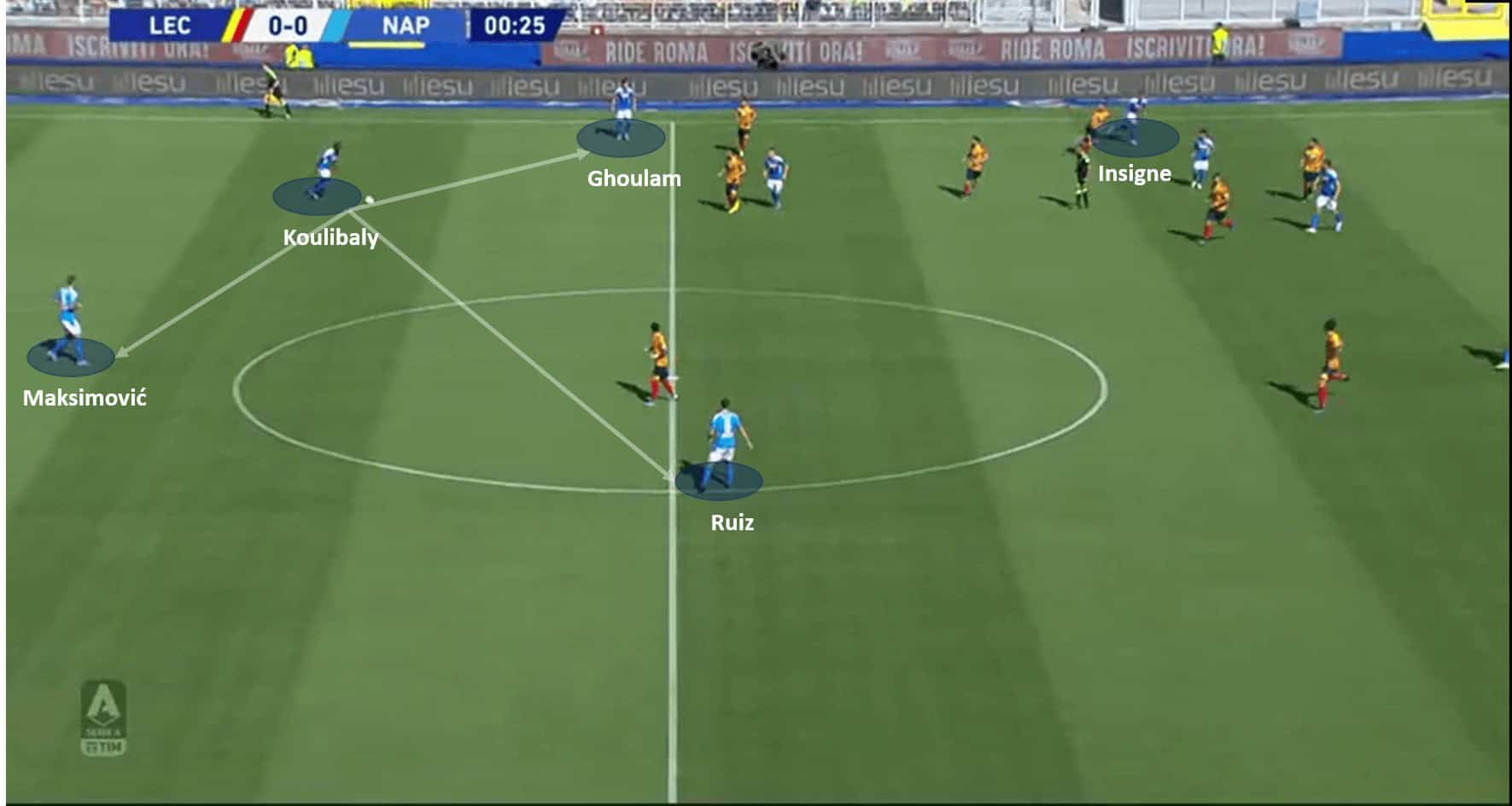 To support the analysis further, a similar instance is recorded from the game Lecce vs Napoli. Inside the first 30 seconds, Koulibaly kick-starts an attack with his long passing. His vision again on display, and re-emphasizing how crucial he is to Napoli’s tactics. He has at least three short passing options, but opts to play an attacking pass to catch the opposition off-guard. The below images support the analysis.
