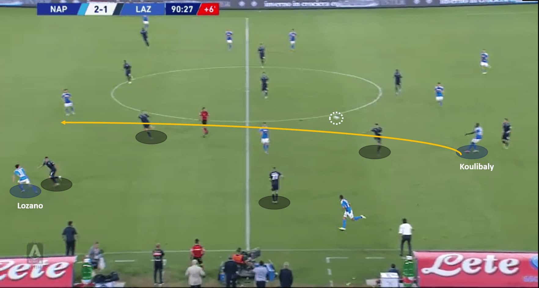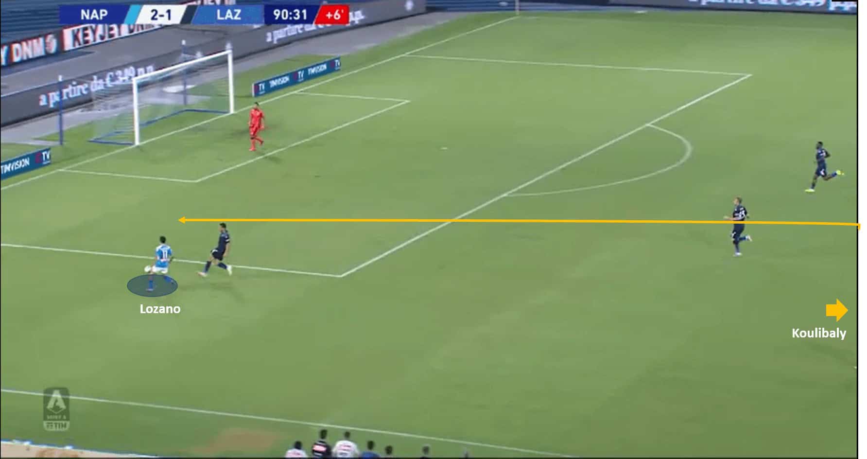 Another such instance to support the analysis, came in the same game when Koulibaly created an attack out of nothing to contribute to Napoli’s attacking tactics. Koulibaly had three safe passing options, and Napoli were leading the 2-1 into injury time. Where most defenders would prefer to kill the game by wasting time, Koulibaly had other ideas. Instead of opting for the easier passes, or time-wasting techniques, he launched an attack from the back trying to utilize Lozano’s pace. Lozano was caught offside by a thin margin however, but the vision by Koulibaly was spectacular. The images below support the analysis.