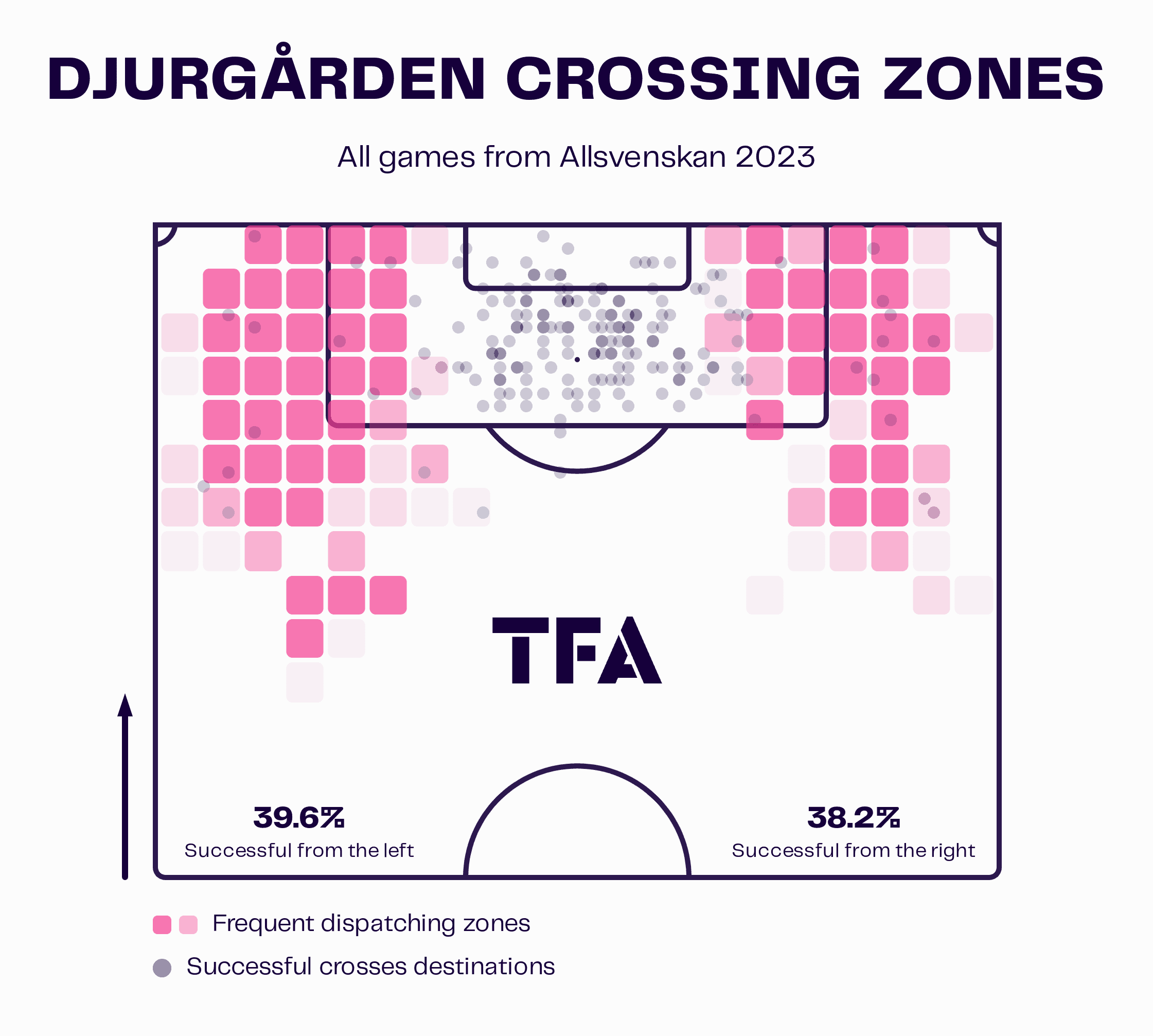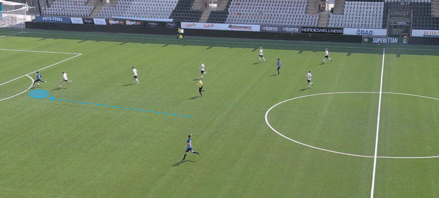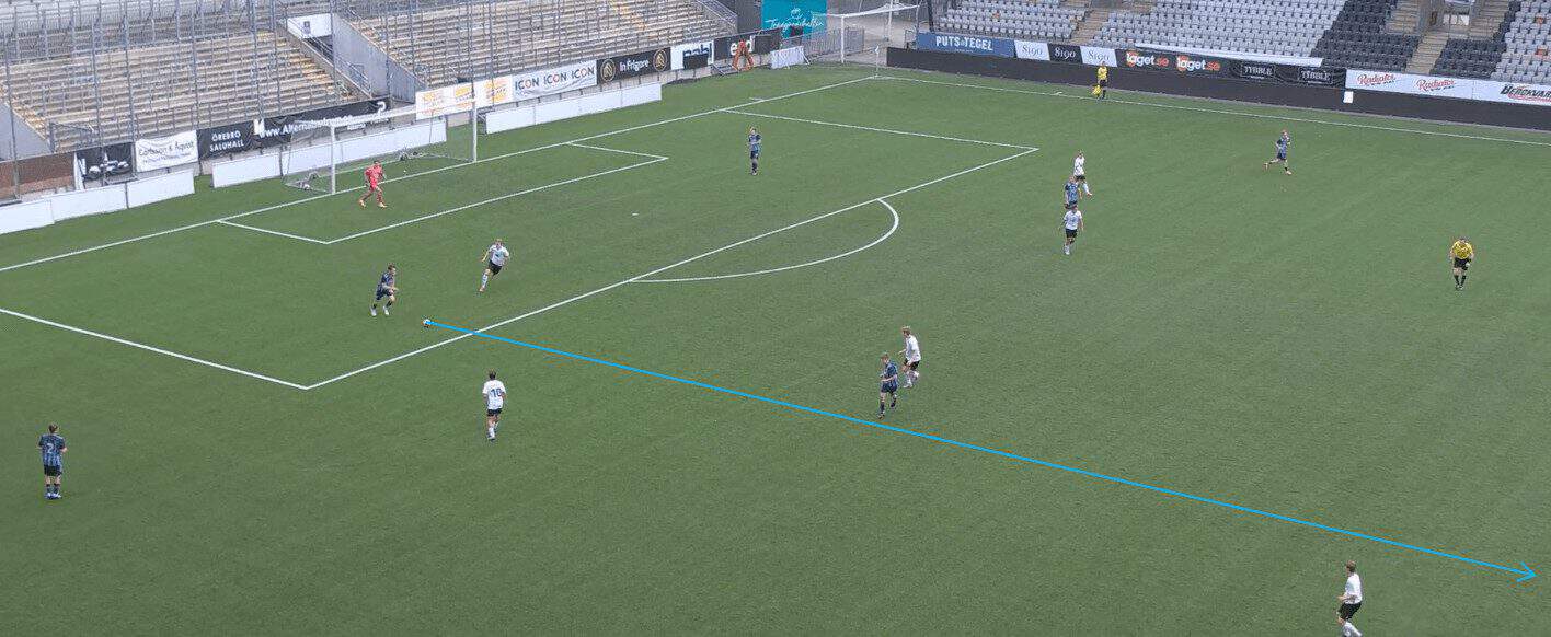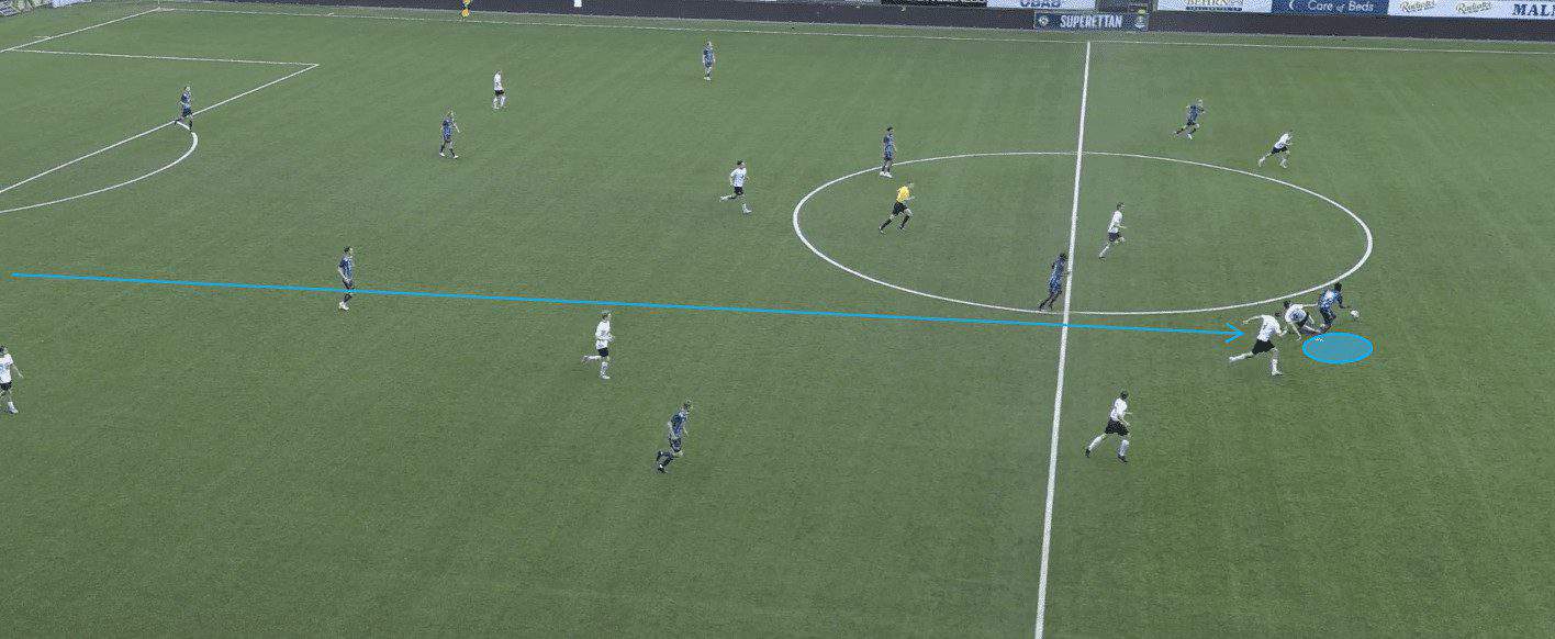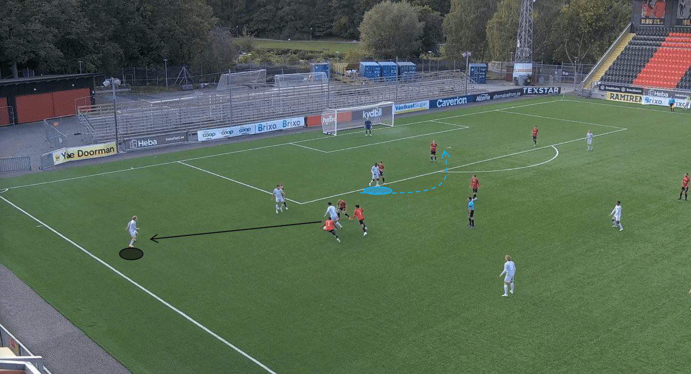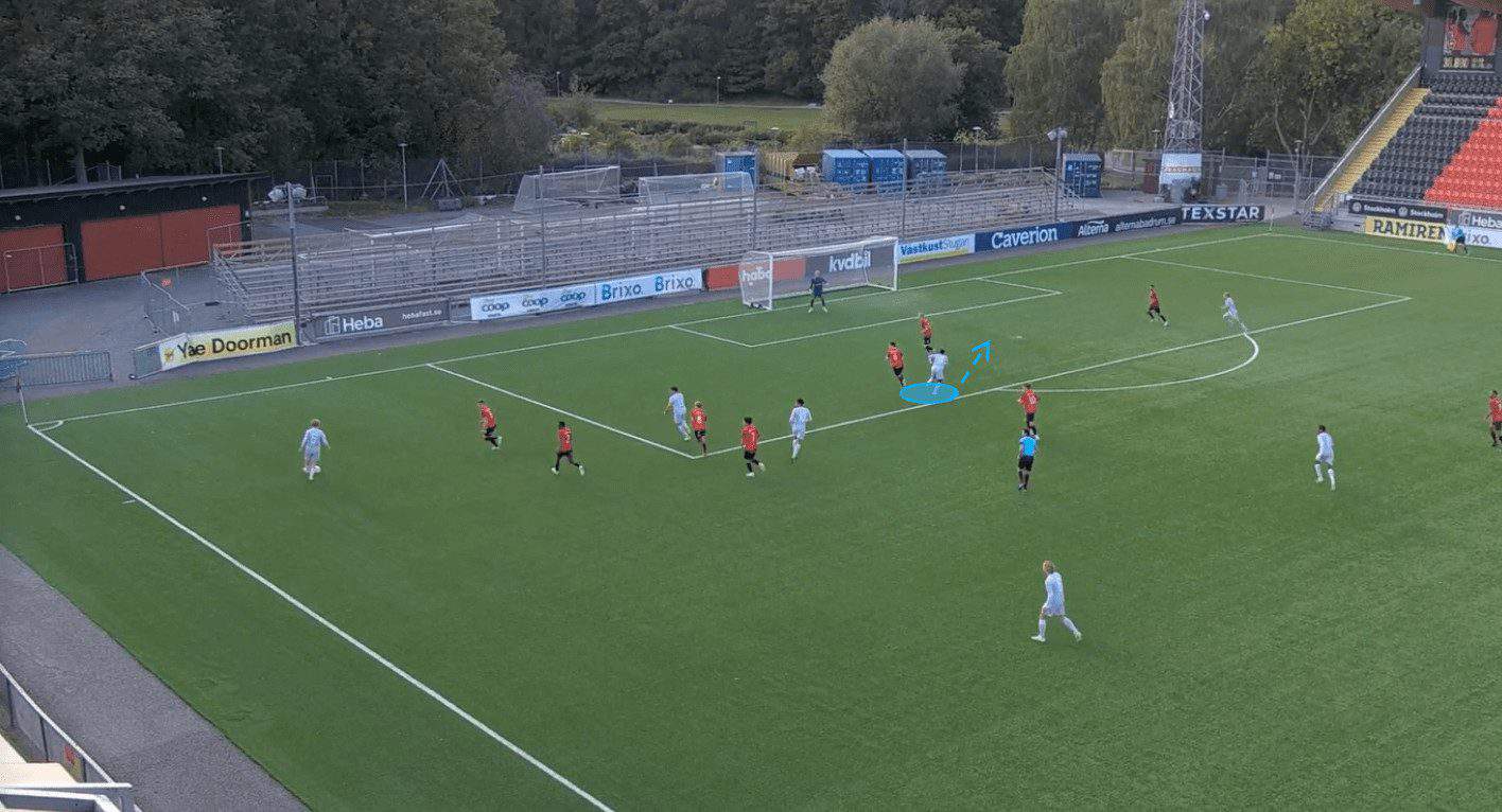 Djurgården’s senior team put 19.06 crosses into the box per 90. Most of their attacking play revolves around getting the ball out to the wide players and then working the ball into the box via a cross or progressive pass. This is why it is essential that Jawla can create space and lose his marker in the opposition’s penalty area; it will increase the likelihood of him being able to get on the end of any crosses coming in.