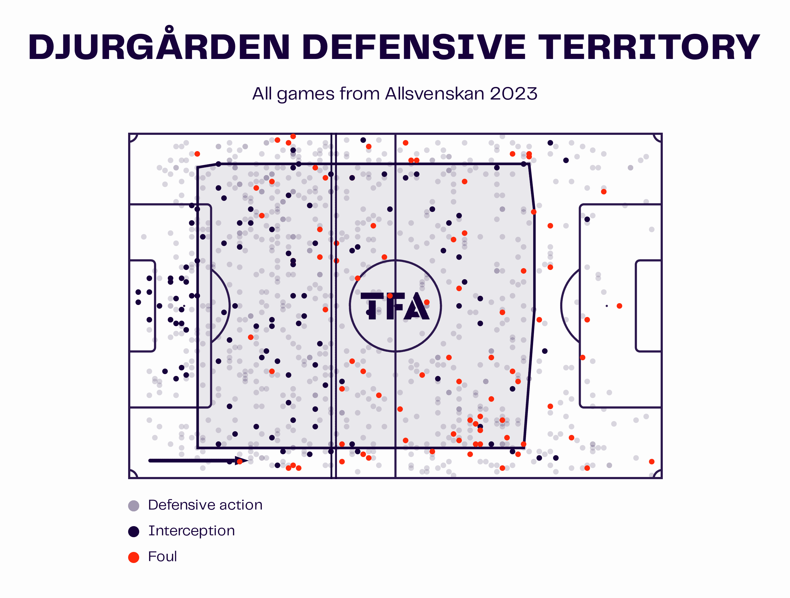 If we look at the defensive territory of the senior team via the data viz above, we can see that their defensive actions take place relatively high up the pitch. With a PPDA of 11.33, they are not the most high-pressing team in the league, but Djurgården tries to limit their opponent’s ability to play out from the back. If given an opportunity in the first team, Jawla would likely be able to adapt to the system relatively quickly. His speed and pressing ability could be beneficial when Djurgården are looking to engage in a counterpress after losing possession.