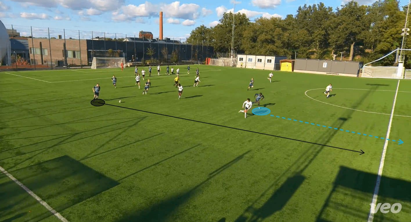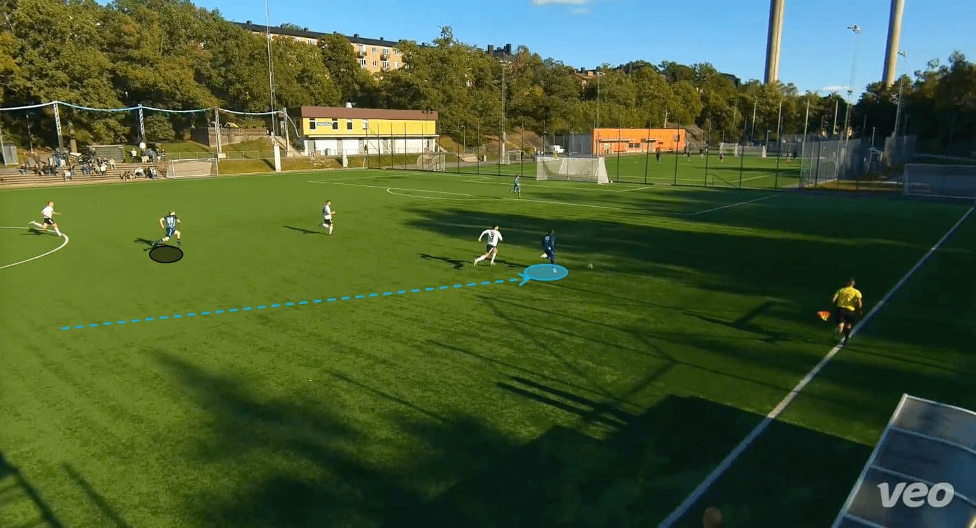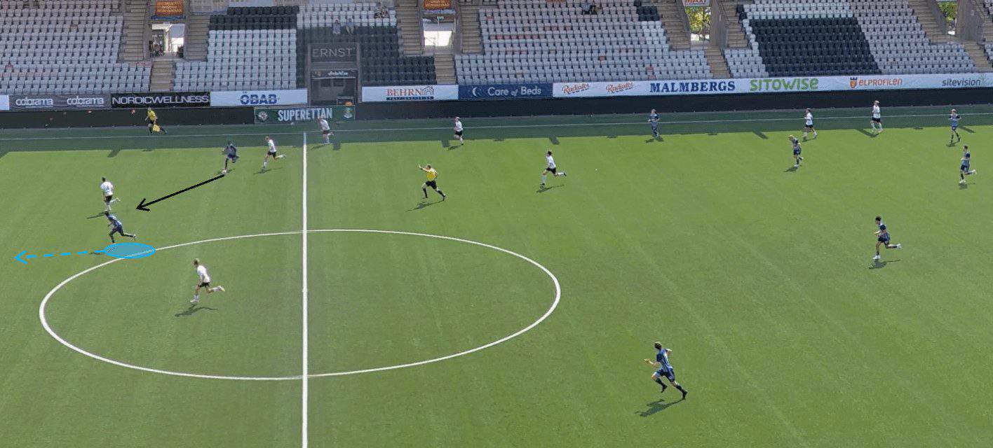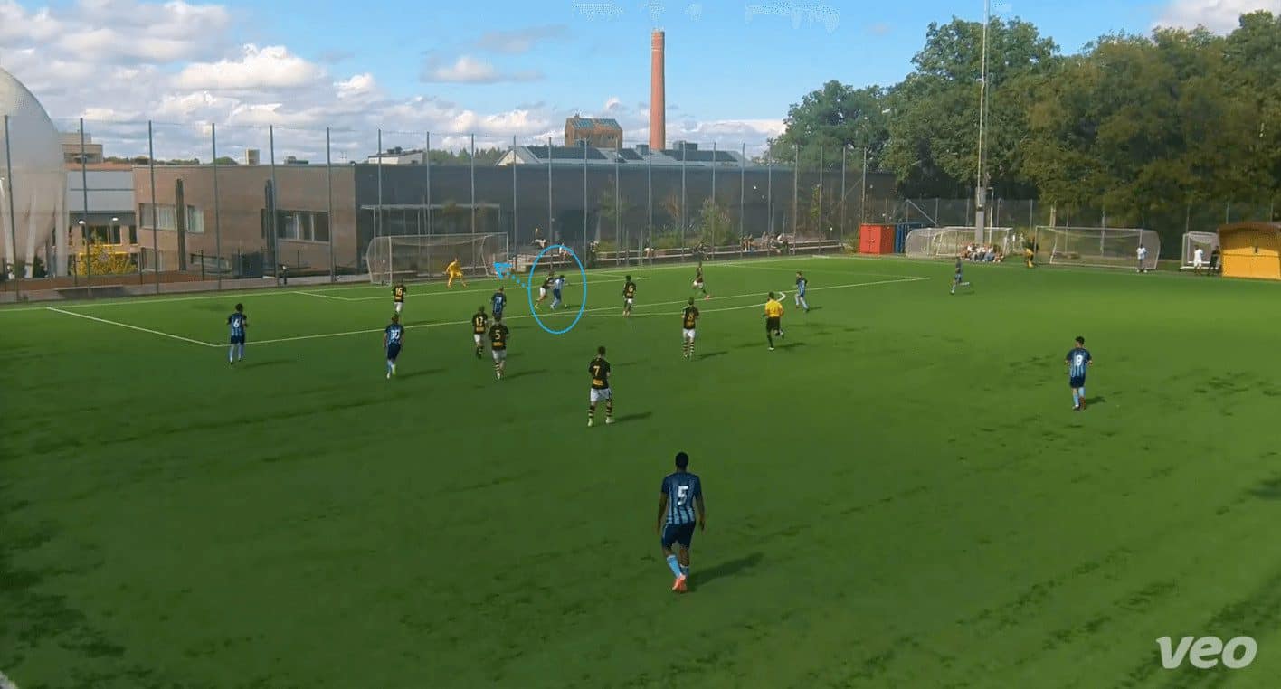 Moreover, the 17-year-old is highly skilled at making these runs from inside his own half. It is something that has become quite effective for Djurgården U19s; they sit in a low block during the defensive phase – almost allowing their opponents to think that they are pinned in. However, upon regaining possession, the ball is swiftly played to a wide player or a central midfielder, who promptly moves it forward into the path of Jawla, breaking through the opposition’s defensive line.