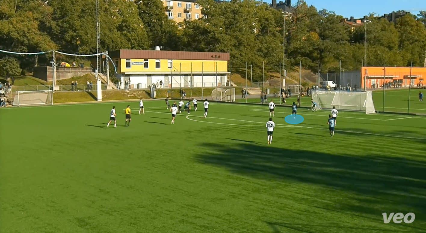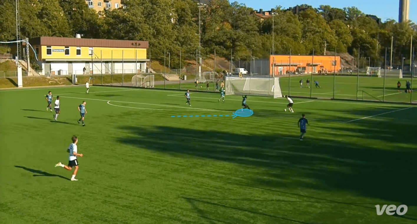 Here, we can see that Djurgården U19s are on the attack. Jawla got into space, and a teammate found him with a pass. The young forward controls the ball well, and instinctively, he looks to drive into the space ahead.