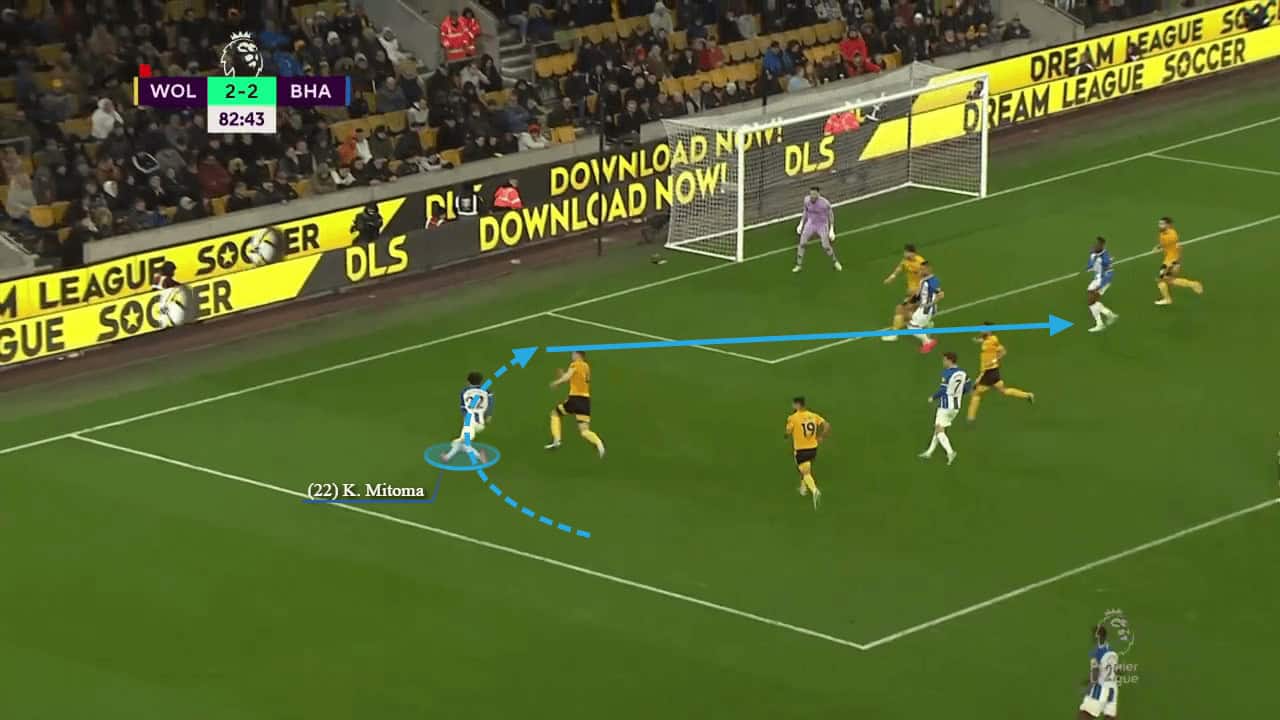 In this image below, Mitoma baits the defender and attacks the by-line, from where he has the vision to cut the ball back to the edge of the six-yard box.