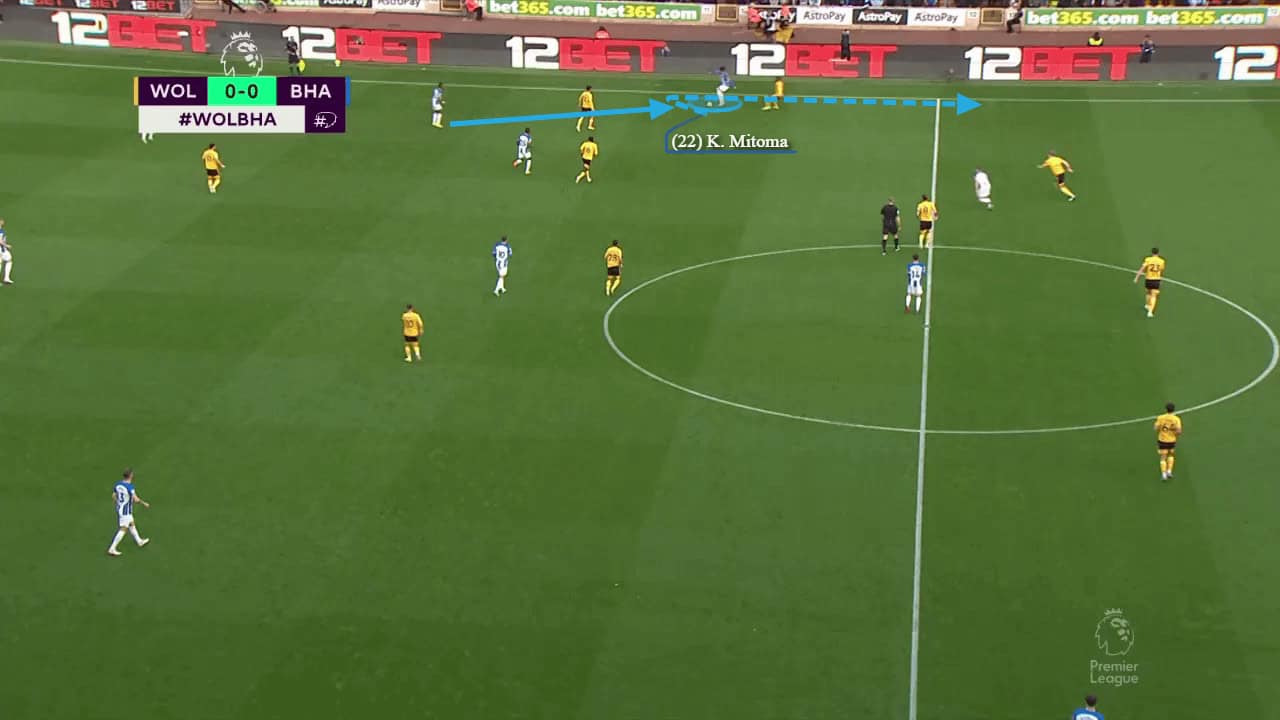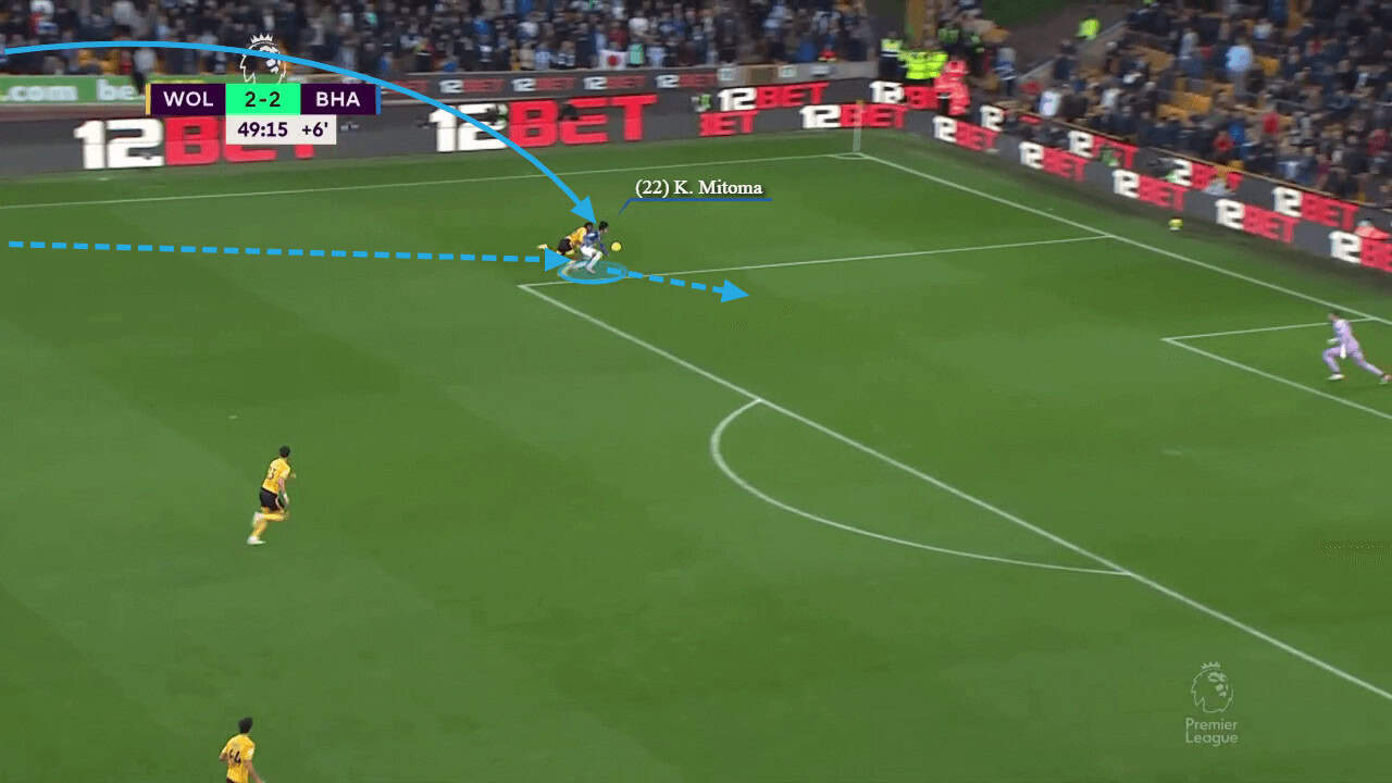 The image below shows how Mitoma receives with his back to goal and evades the pressure to begin an attack for Brighton.