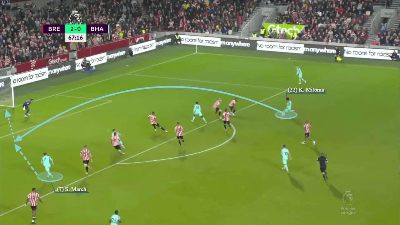 As shown below, Mitoma plays the cross into Solly March who has a free unopposed header from six yards out.