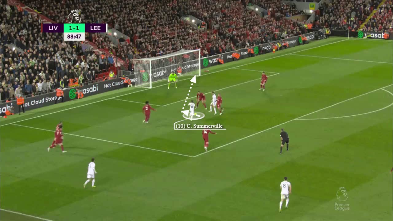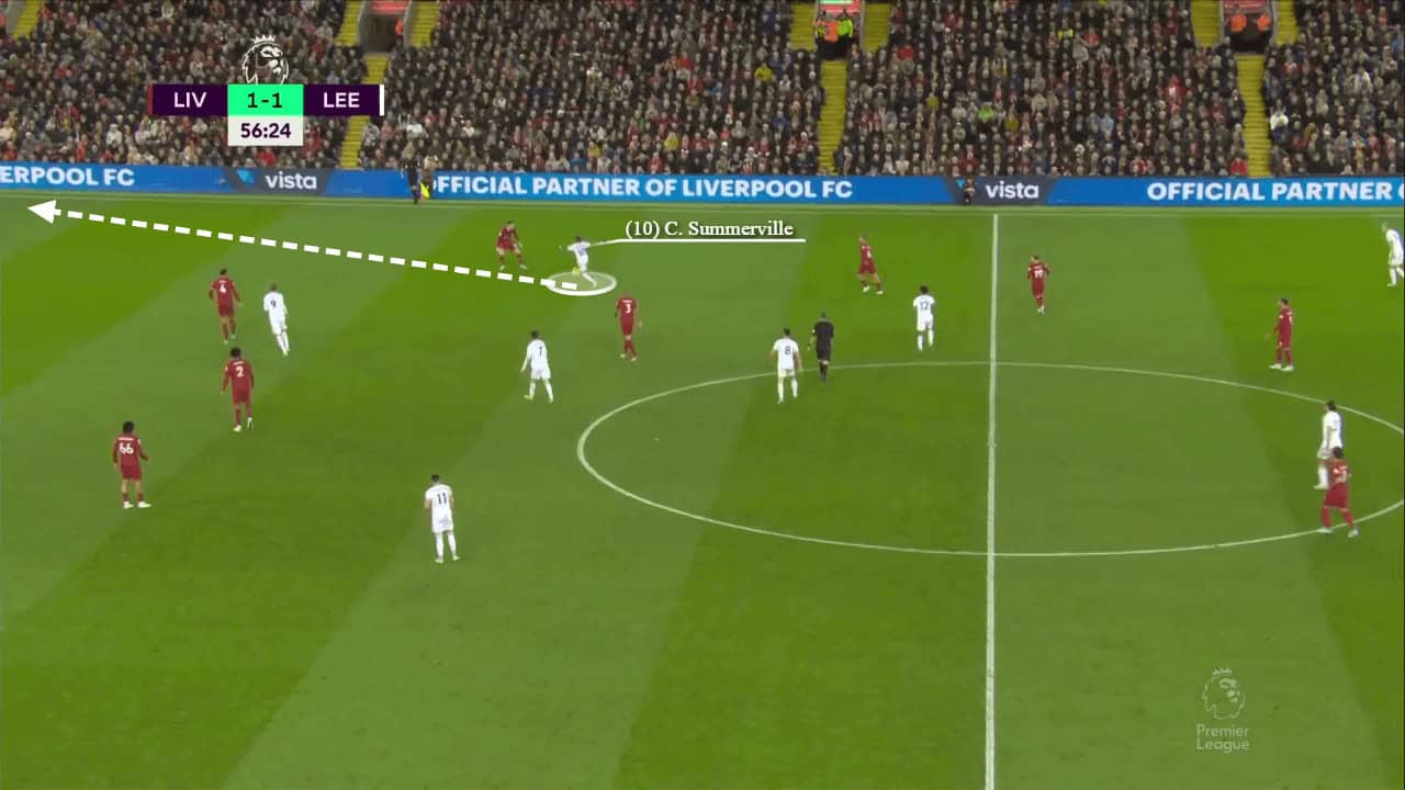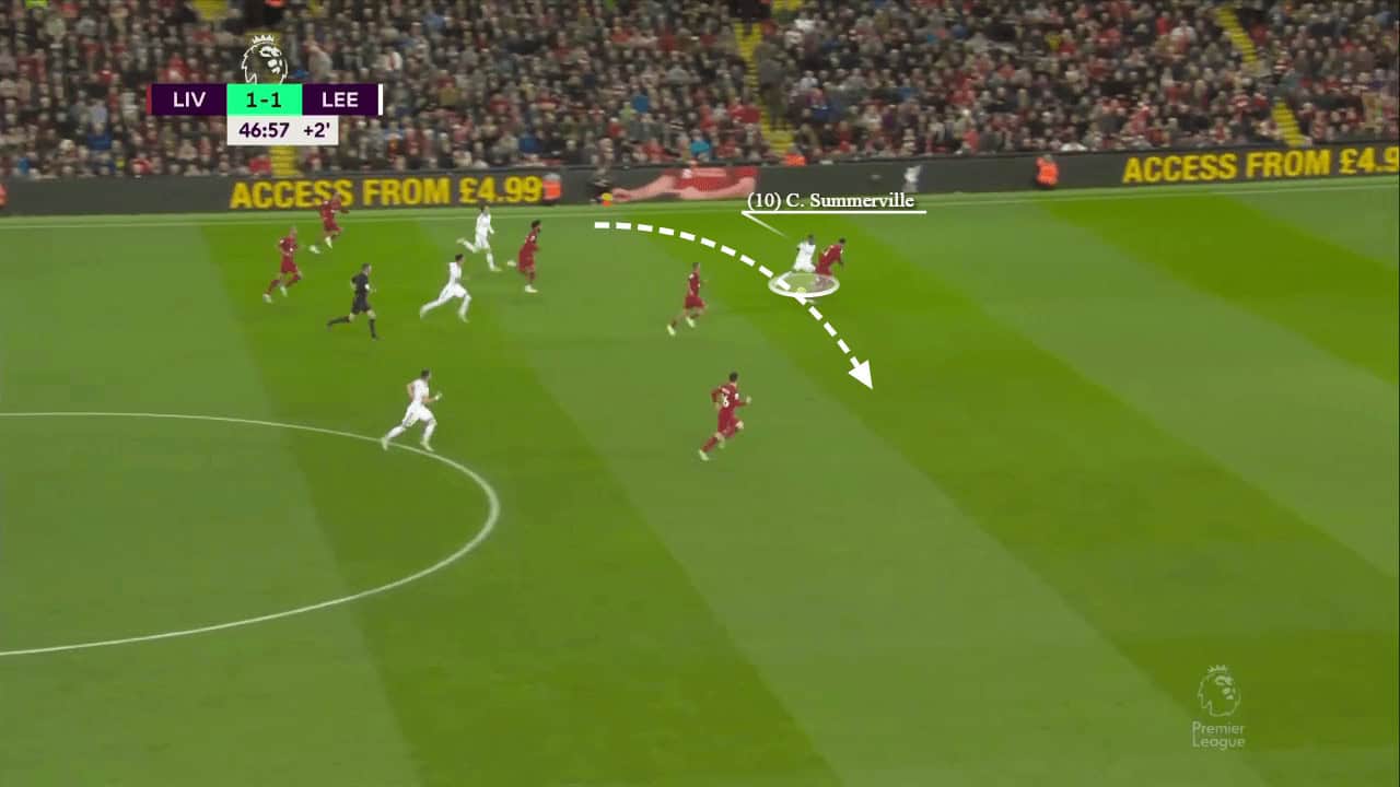 The image below shows Summerville cutting inside, attacking the goal more centrally, from where he could either shoot or pass, rather than being limited from a wider position.