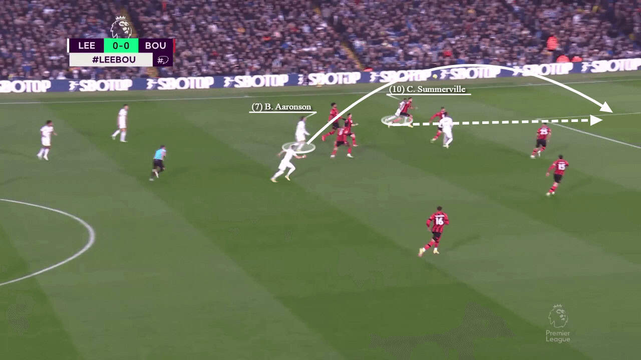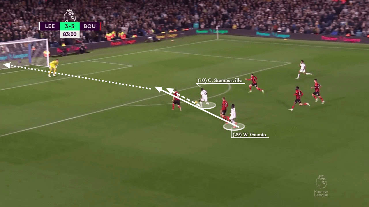 In the counterattack against Bournemouth, Summerville starts in a wider position, but when the defenders move wide and leave the central channel open, the Dutchman notices the open space and attacks it.
