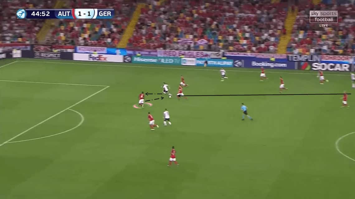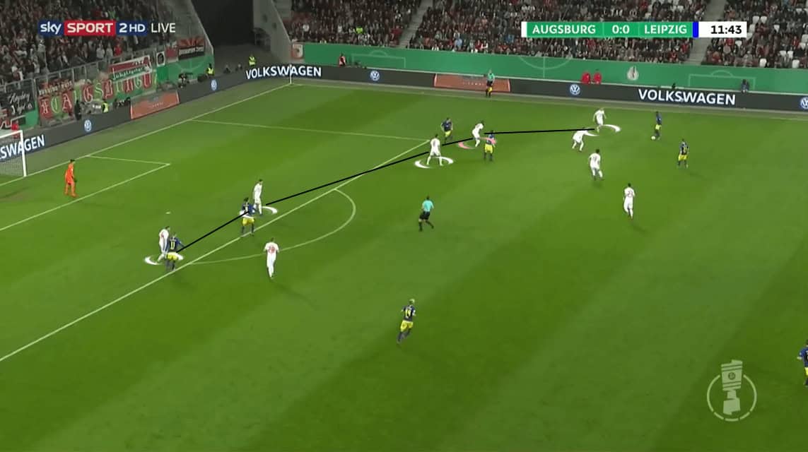 In the situation below, Leipzig distributed the ball wide, and Sabitzer found spaces to run onto the through ball.
