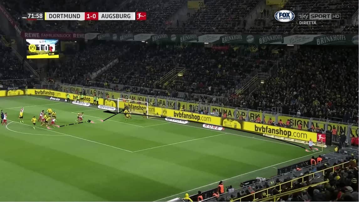 In Augsburg’s general build-up shape, both wing-backs had the option of making overlaps to the other side of the pitch.