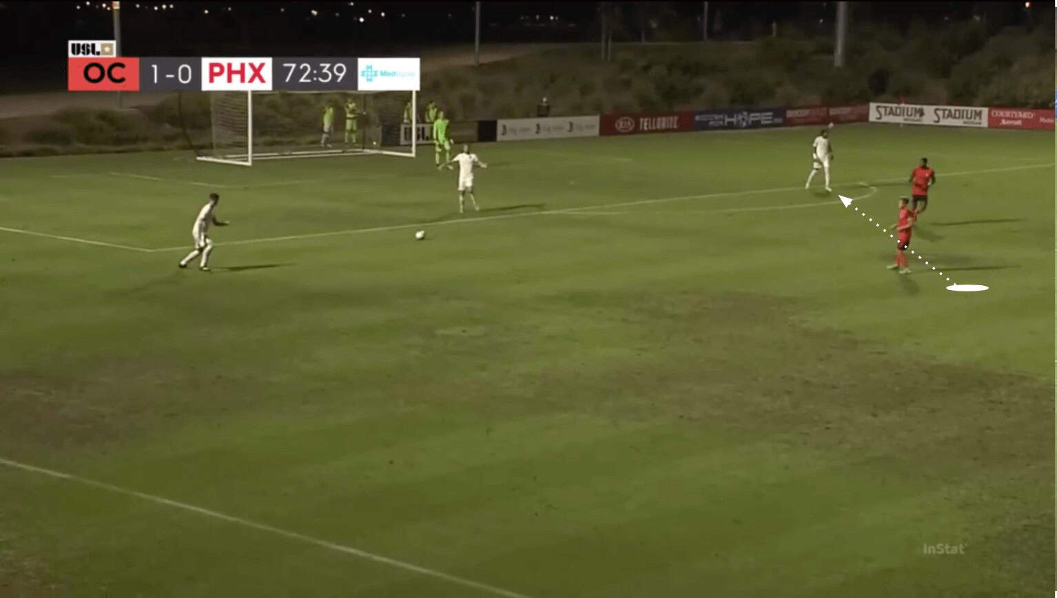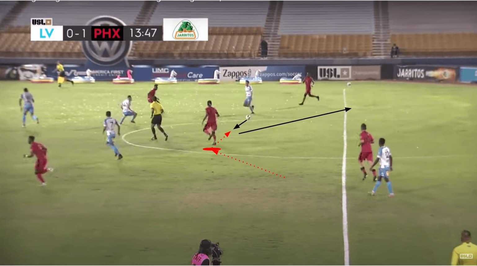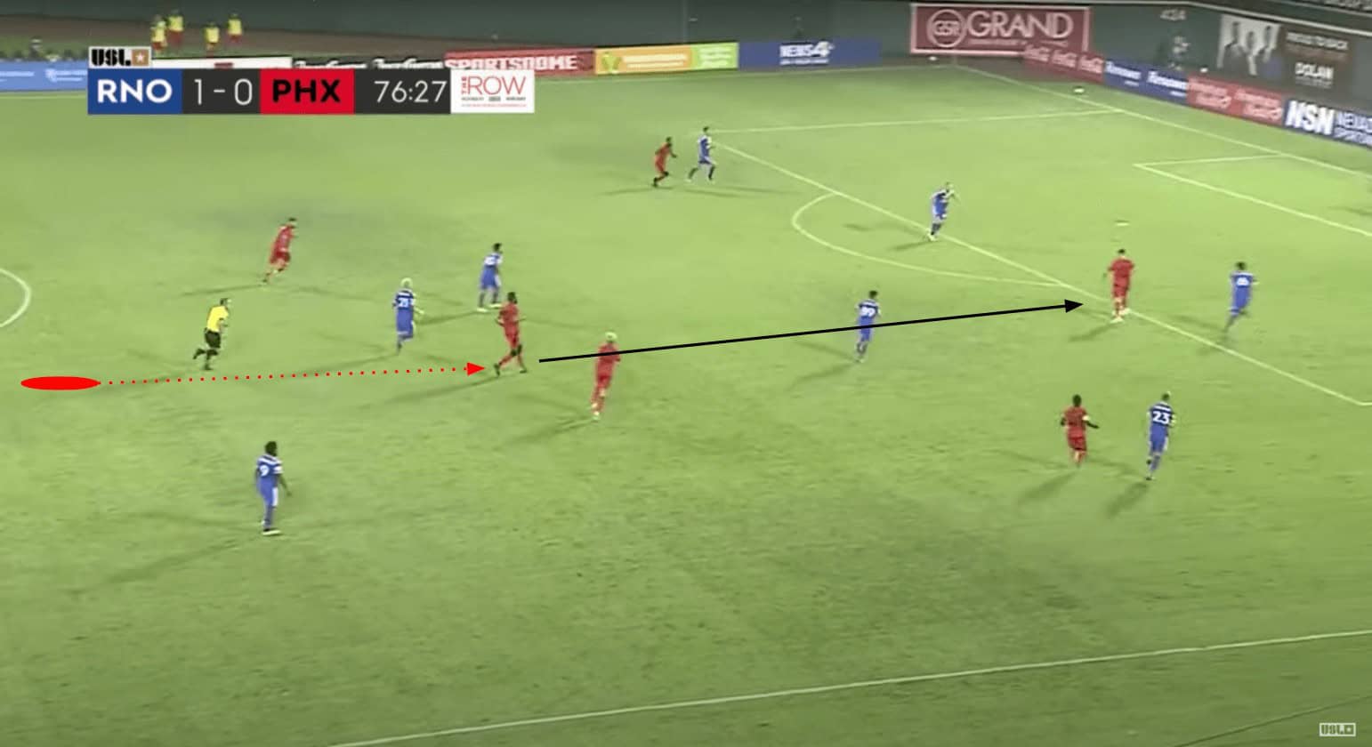 Lambert is one of the most defensively solid midfielders in the USL. The problems in his game mostly occur when Phoenix is in possession and looking to progress up the pitch from their own penalty area. While he can often pick out passes when facing the goal, Lambert seems way less comfortable in possession when he’s under pressure or has his back towards the goal.