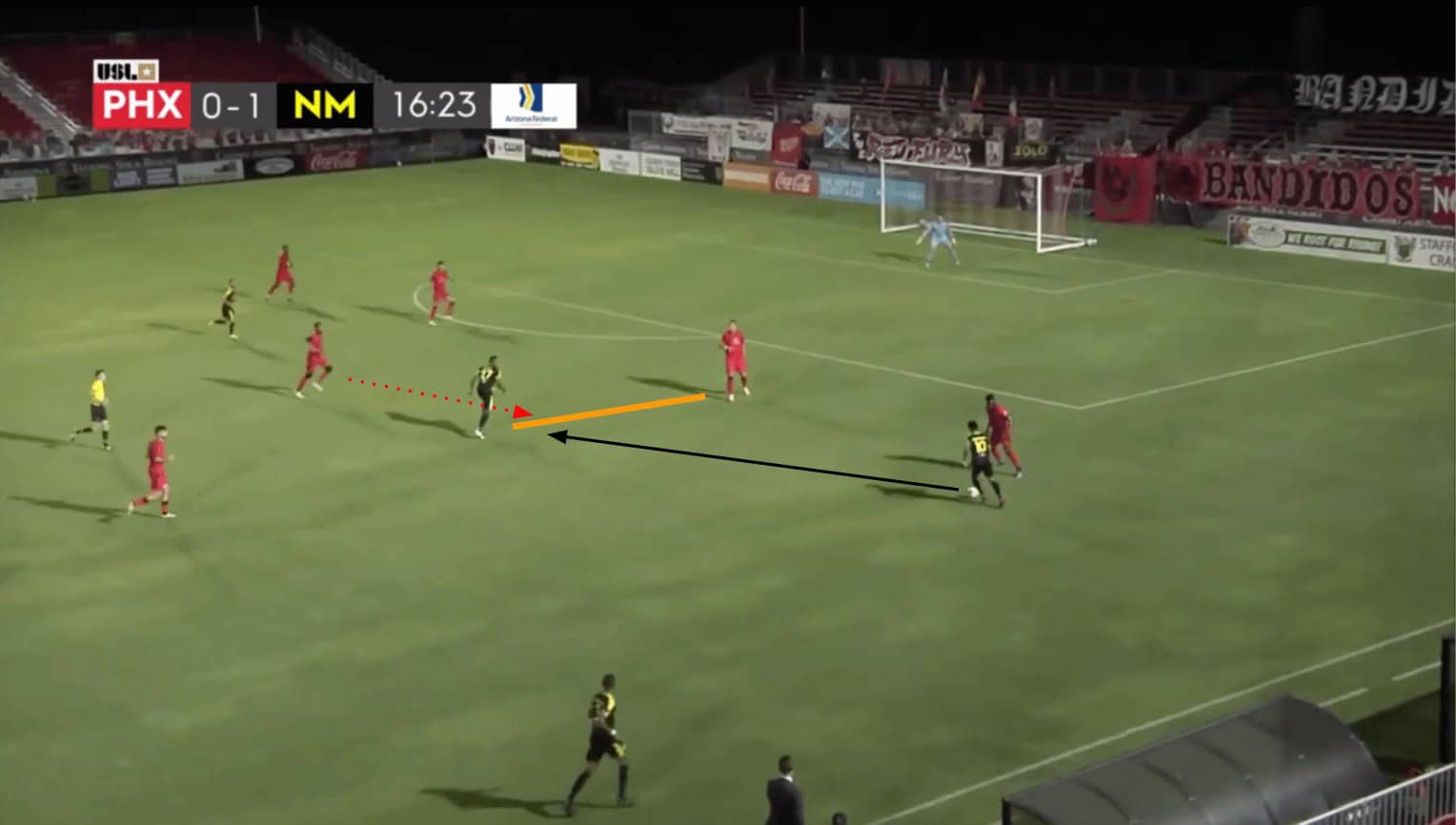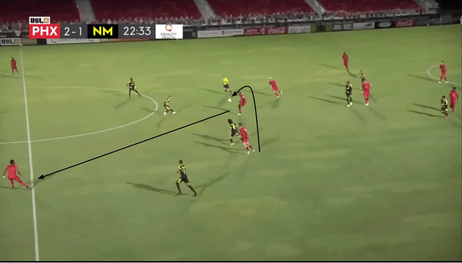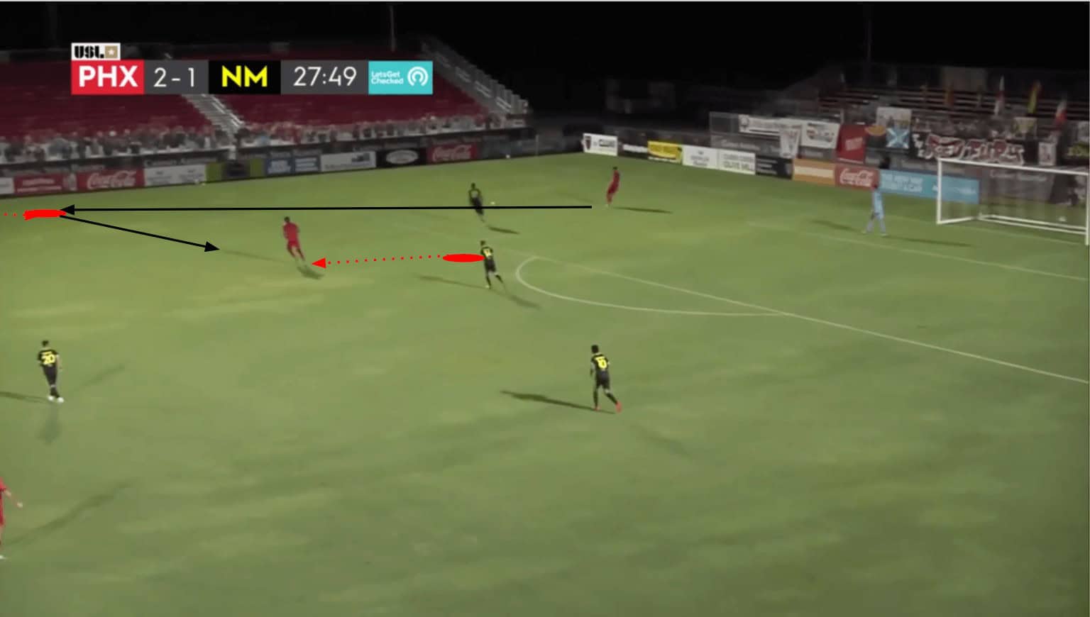 Similarly, against New Mexico, Lambert was able to produce a similar pass that again found Junior Flemmings. This time, he was able to use his first touch to take a pass out of the air following a mistouch from Jon Bakero. Lambert’s pass not only took the ball out of the air but also allowed Phoenix to again move up the pitch. This time, his pass resulted in a Solmon Asante shot that was ultimately saved by the goalkeeper.