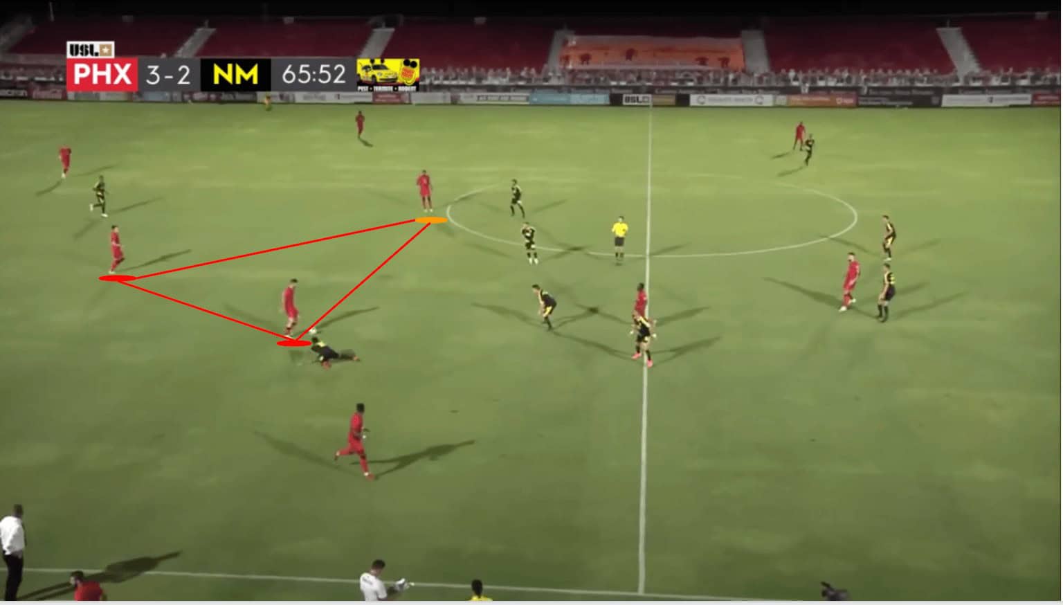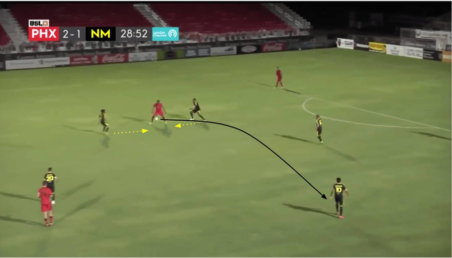 The first example comes from Rising’s match against New Mexico. As he received the ball from his centre-back, Lambert attempted to turn as the ball arrived. The problem wasn’t with this idea, but rather the execution of it. As he attempted to turn, the ball popped up off of his foot. As it hung in the air, the two New Mexico defenders collapsed on Lambert, causing him to panic. In his panic, Lambert played a pass directly to the opponent. While the smart move would have been to send the ball long and out of pressure, Lambert was unable to do so, and Phoenix was immediately put under pressure again. There are multiple examples of Lambert being put in this scenario, which ultimately result in him playing some aerial pass (sometimes as a result of a poor touch) that puts Phoenix under pressure.