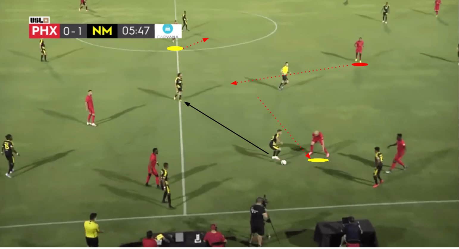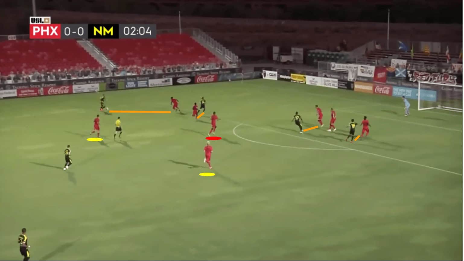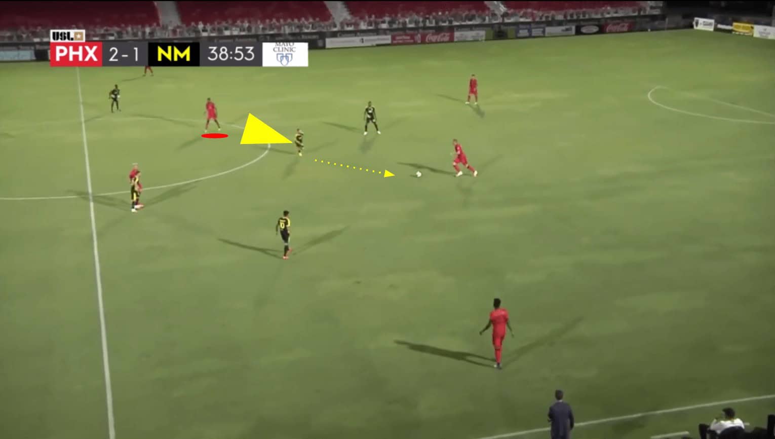 Lambert’s protection of the back line and his positioning to deter interior passes also make him a huge asset for Phoenix. In the image above, Lambert again sits off of the two other midfielders (marked in yellow). Instead of marking the man in front of him closely, Lambert’s first priority is to deny passes into forwards. Those passes against Phoenix can often be deadly, as Rising’s centre-backs tend to close down aggressively yet slowly, often getting beaten in the process. Lambert stayed put in this scenario until the ball was played horizontally. At that point, he closed down his man while preventing any vertical passes from occurring, forcing New Mexico to continue to move the ball horizontally across the pitch.