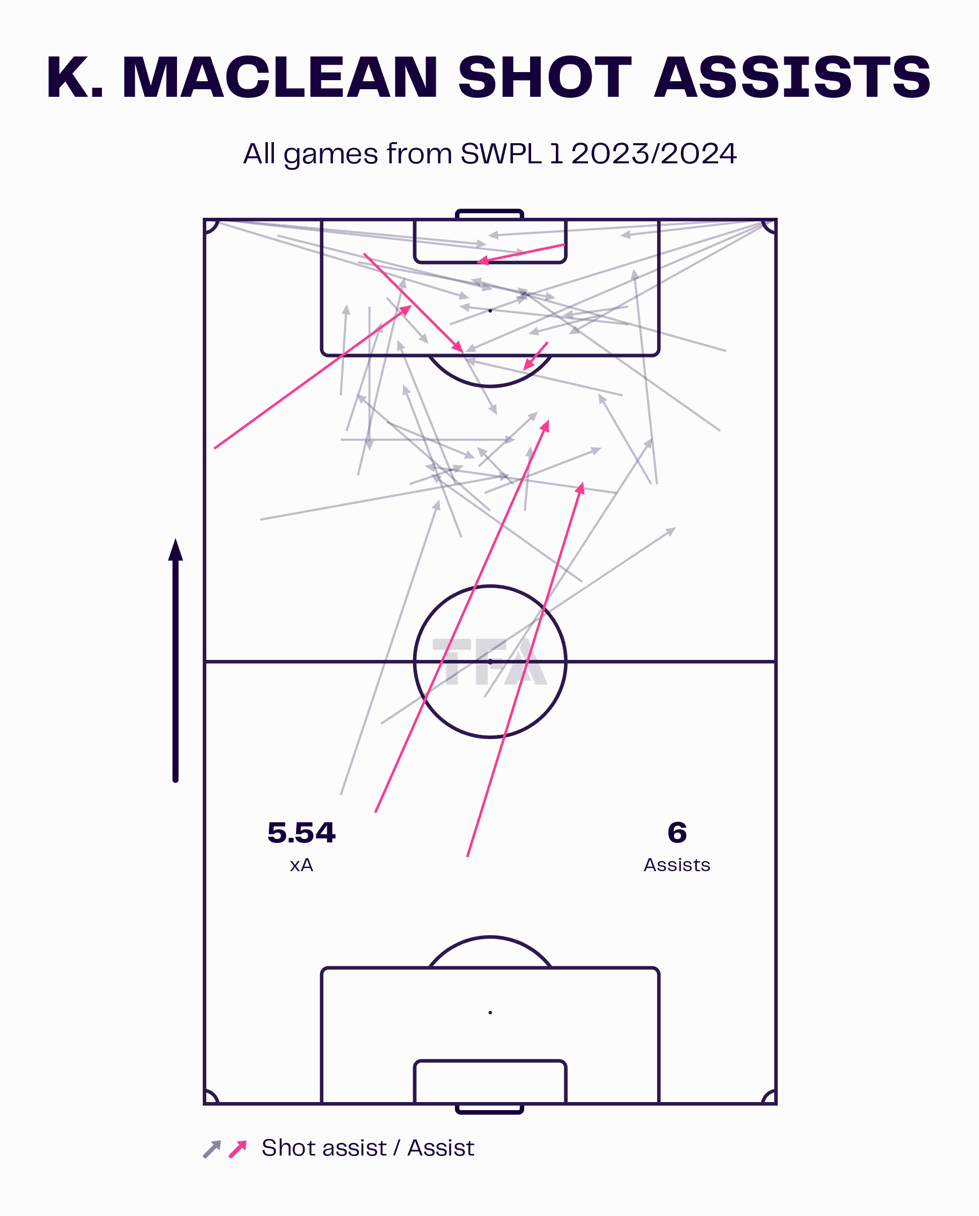 The above figure shows the number of shots Rangers are able to generate from Kirsty’s set piece; in particular, note the deliveries taken from the corner spots, as those are the ones we can assume are set-piece deliveries.