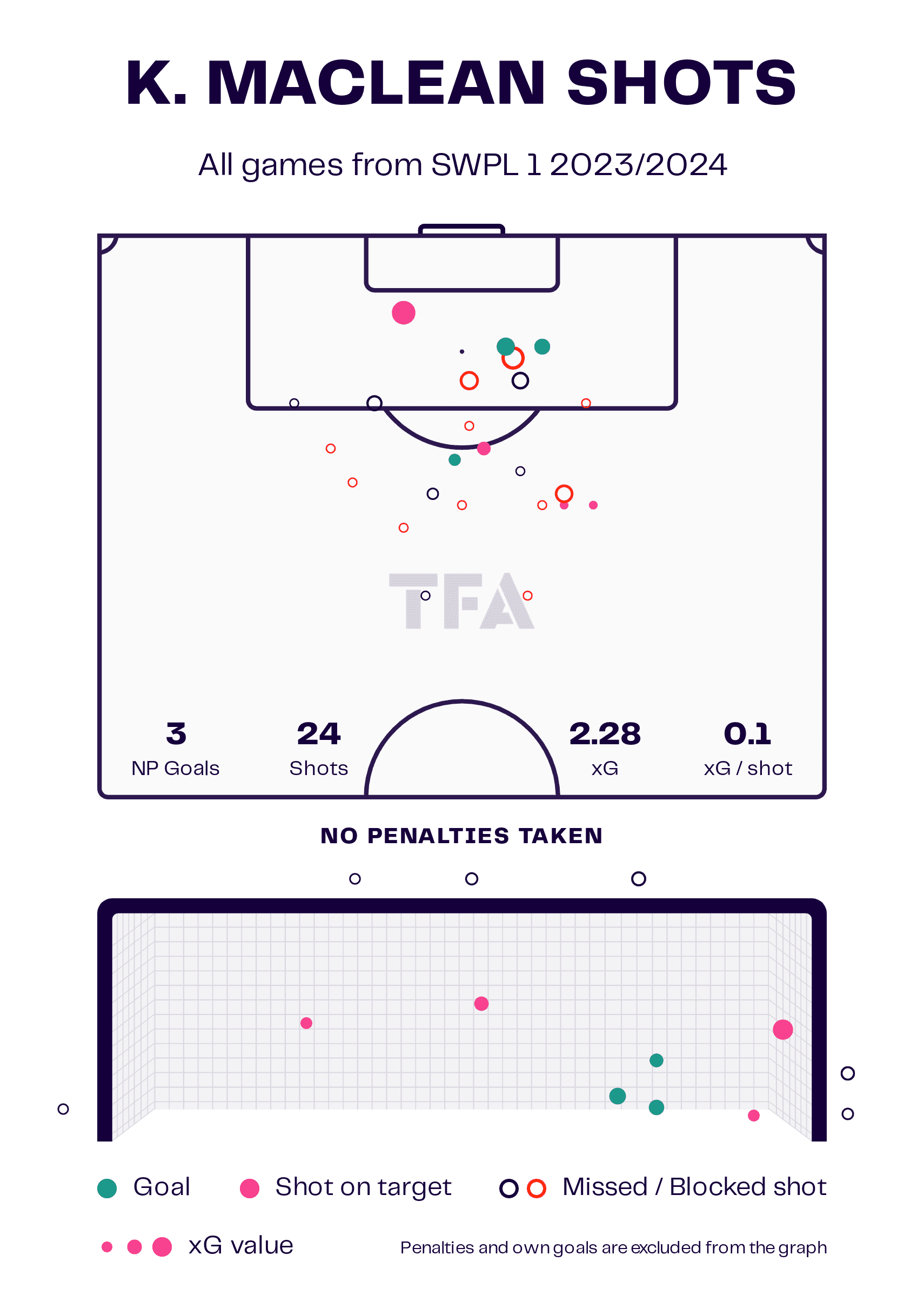 With Kirsty averaging an xG of 0.14 per 90 and converting on 0.18 goals per 90.