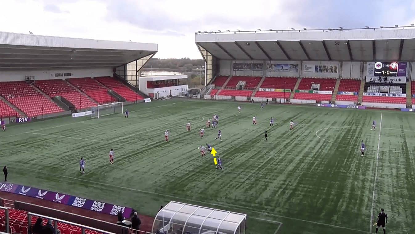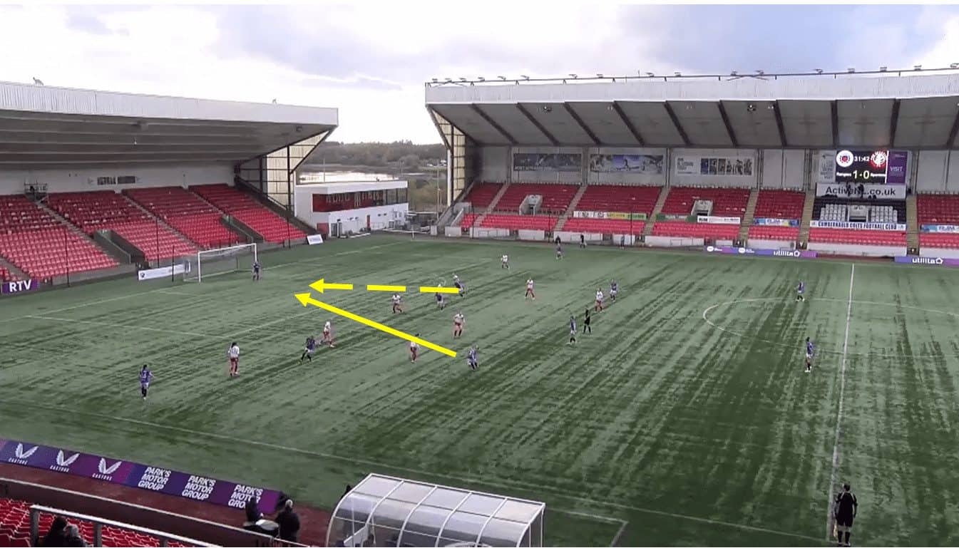 This creates the angle and space she needs to play a through ball for a teammate to run onto; unfortunately, the Montrose defence tracks the run well and can block the shot.