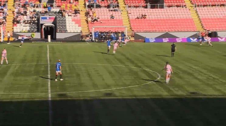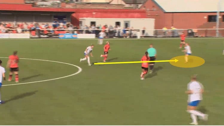 From there, with two players in her face trying to block the pass, she plays an excellent left-footed through ball that curls around the right centre-back and into the path of on-rushing forward Mia McAulay, who finishes it off nicely.