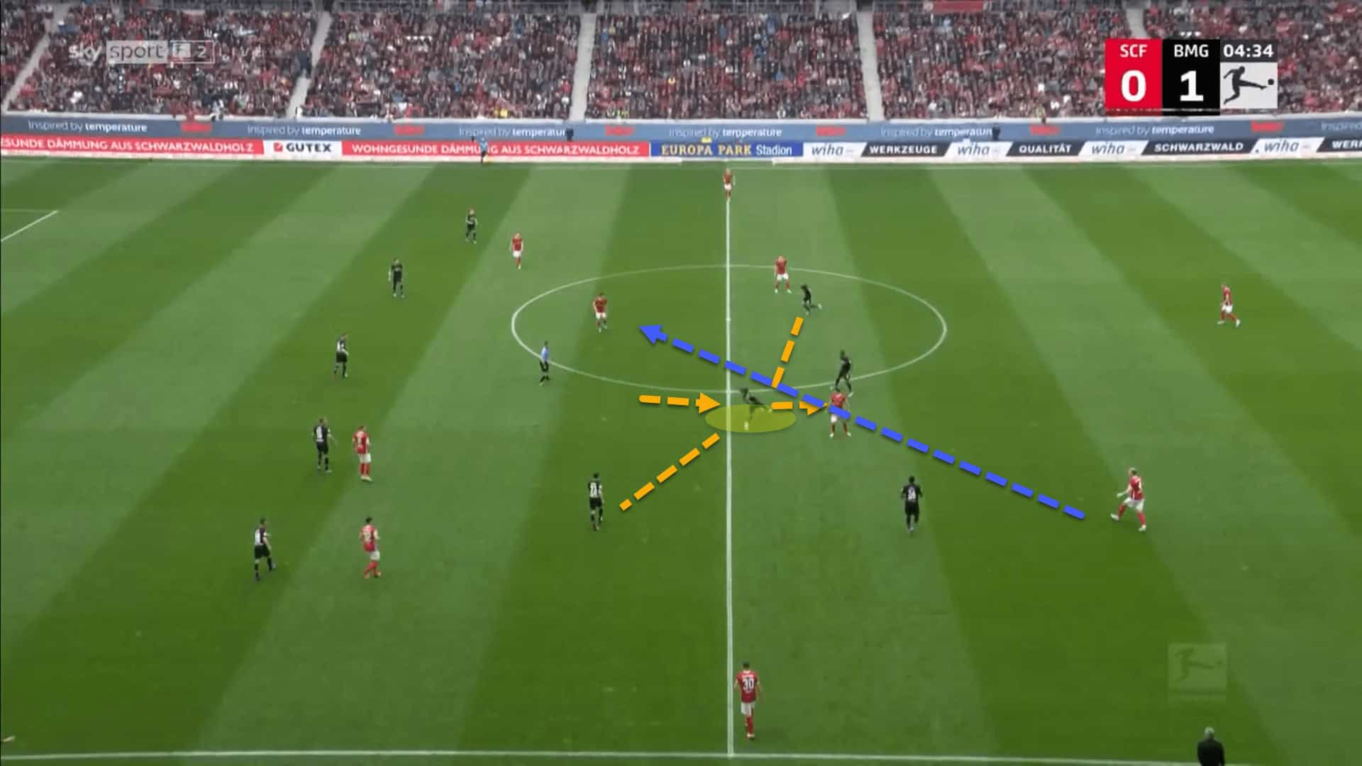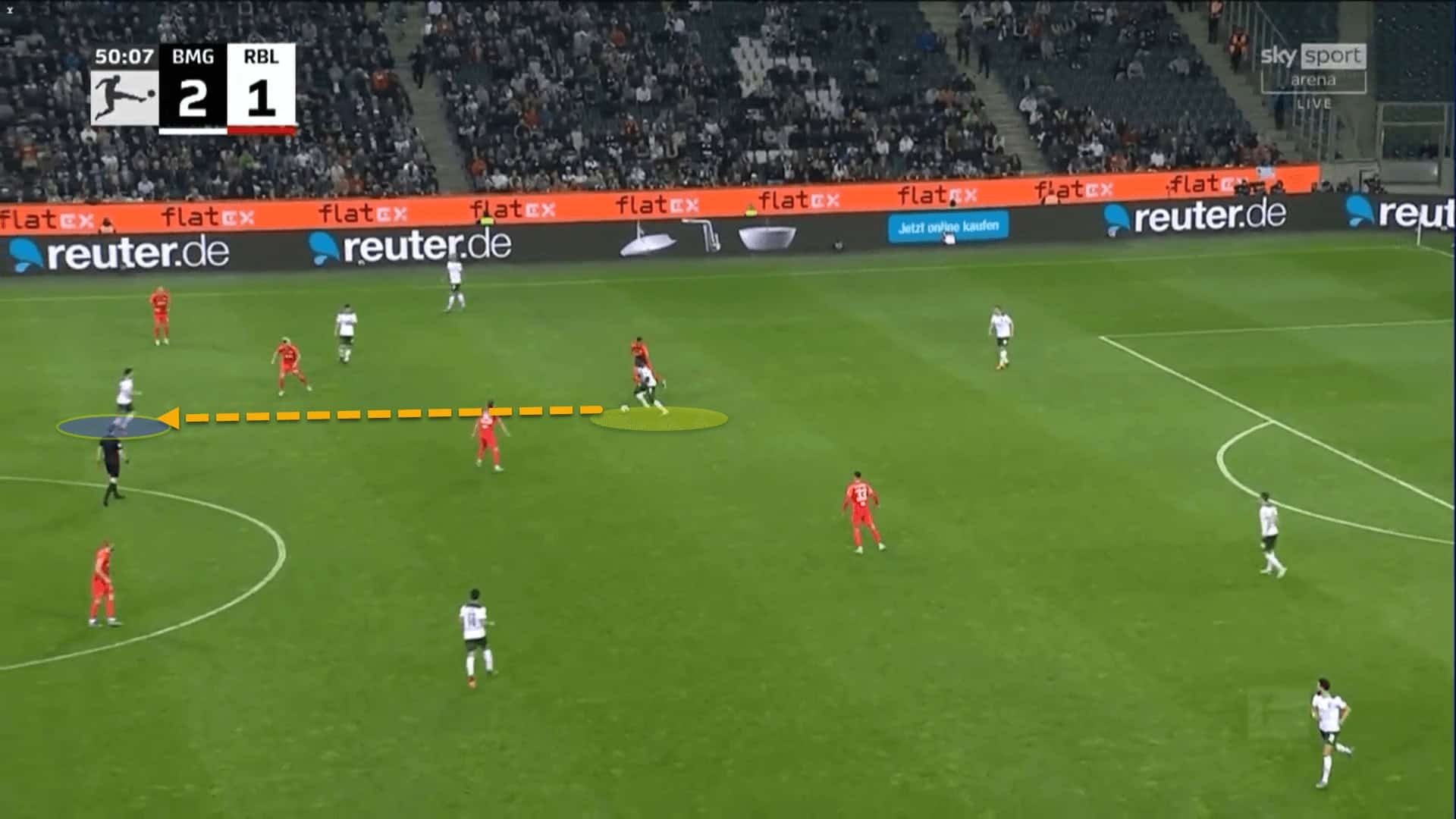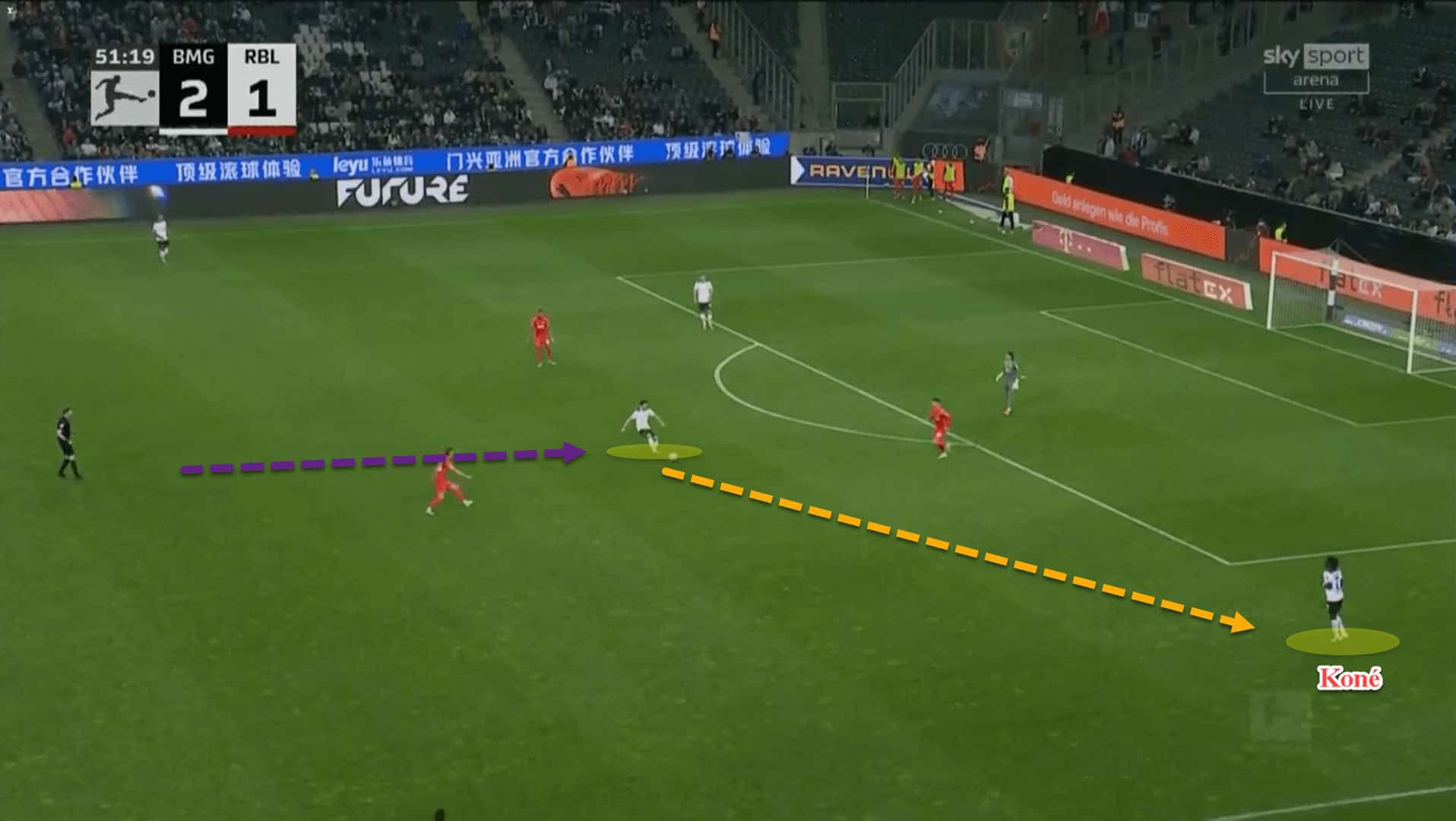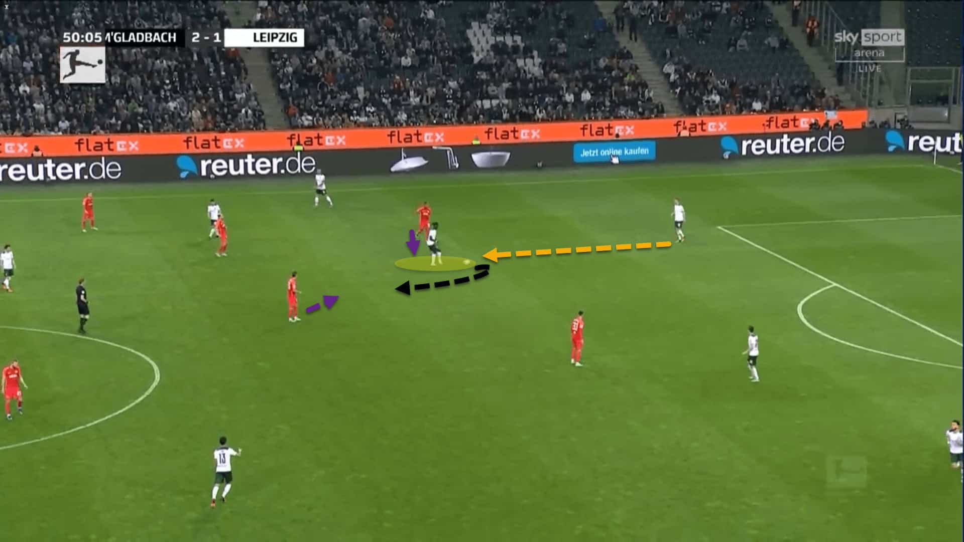 Here, Koné is sitting behind the opponent’s first pressing line and is receiving the ball from Mönchengladbach’s right centre-back.