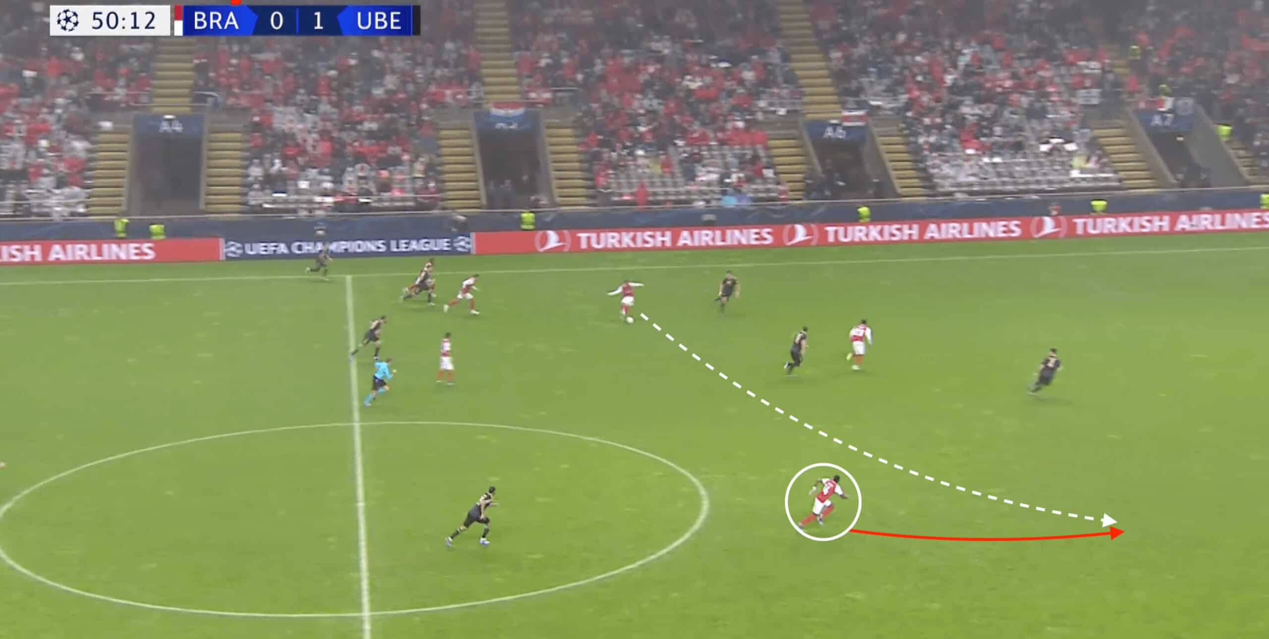 This is still evident when observing his early performances this season. Still, crucially, his varied positioning causes increased stress for the opposition defenders, especially when storming the space on the right flank, which had been deserted due to Ocampos dropping deeper to collect the ball.