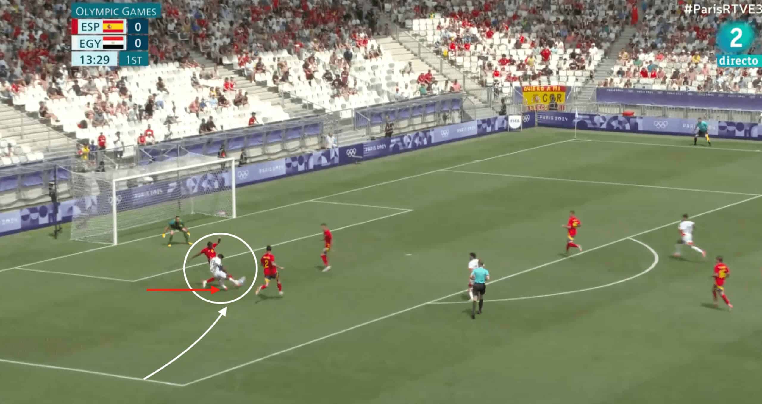 His ability to track runners floating inside the pitch and protect the interior spaces of the pitch has allowed him to showcase his defensive talents in 1v1 scenarios, as shown below when representing his country en route to a gold medal at the Paris Olympics.