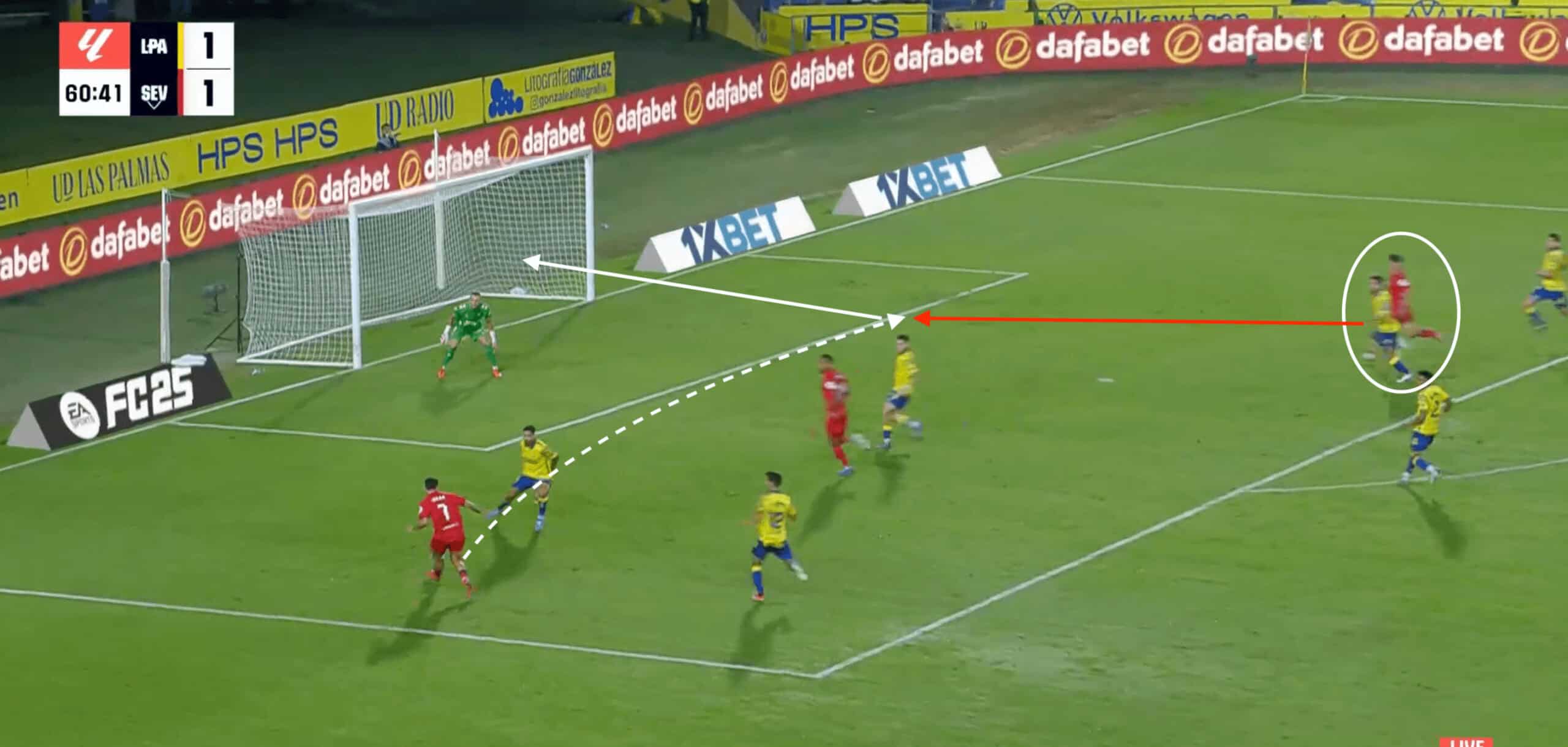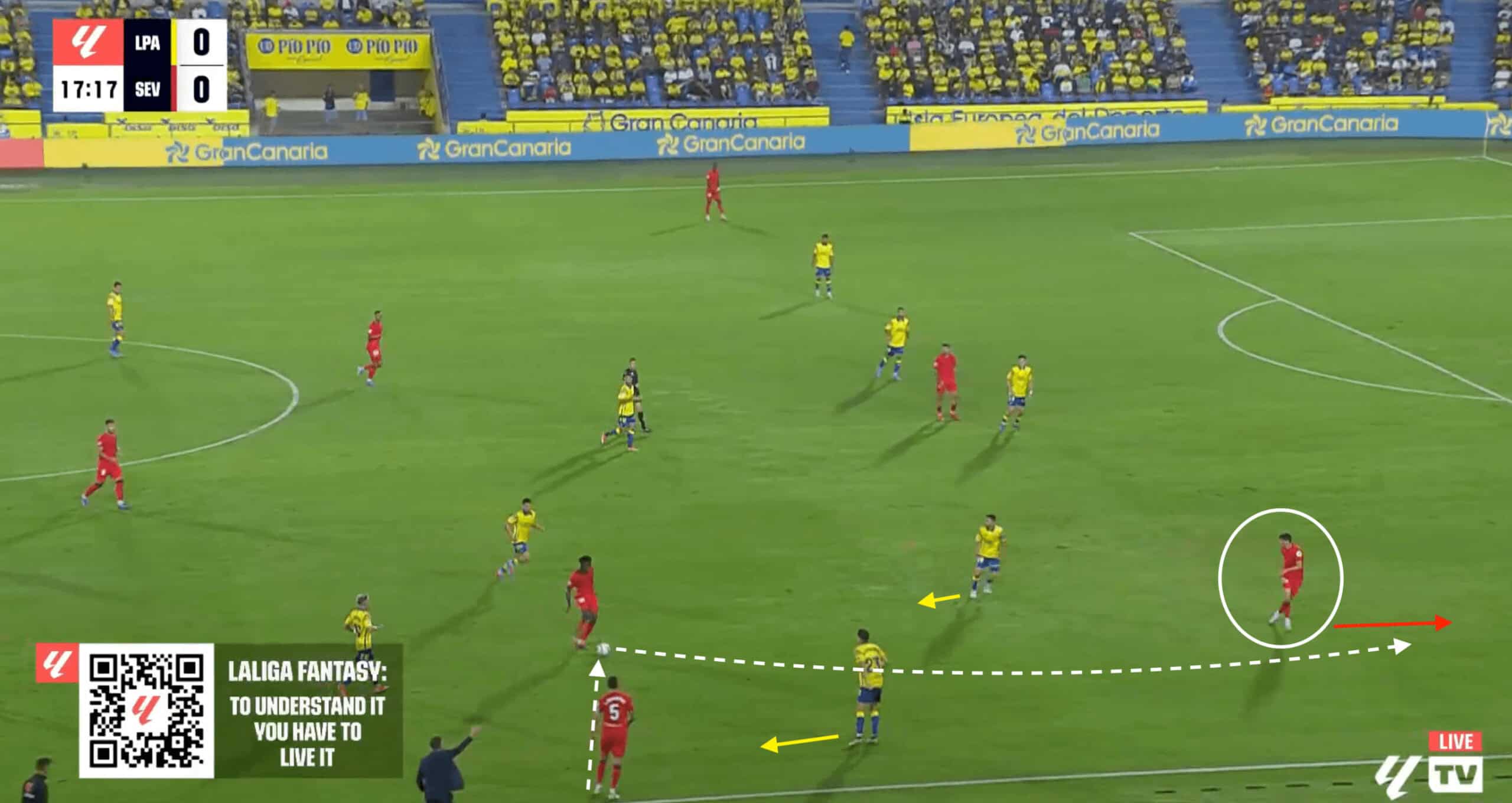 The energetic nature of Sánchez’s pressing efforts also meant that Pimienta entrusted him with a poignant role as the first line of Sevilla’s resistance early on in their match against Las Palmas. Sánchez accompanying Romero up front created a 4-4-2 out-of-possession.