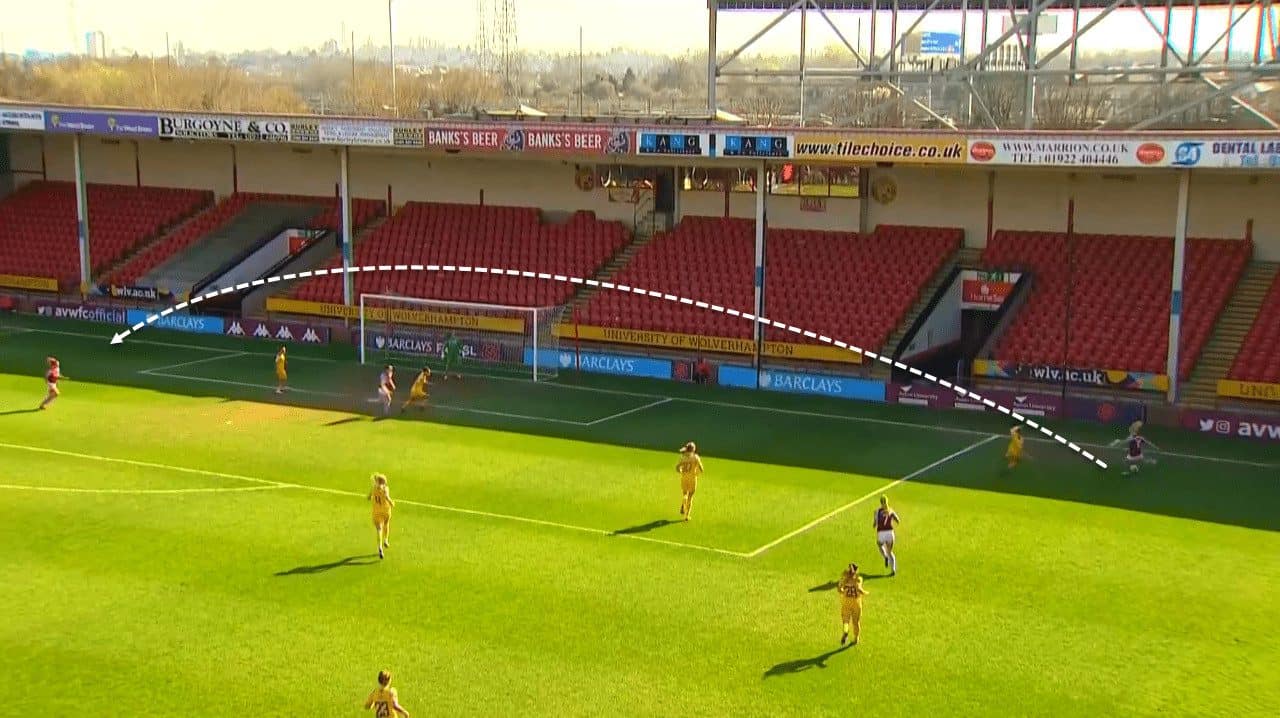 The quality of her crosses can be considered excellent because she executes them with the correct technique and usually creates danger with such accurate long passes. Her passing accuracy reaches 81.2% overall, and her long passing accuracy equals 48% at the moment. This picture highlights a perfect example of Blindkildes crossing quality and shows that the English player can be a valuable source of goals for her teams using key crosses like the one shown below.