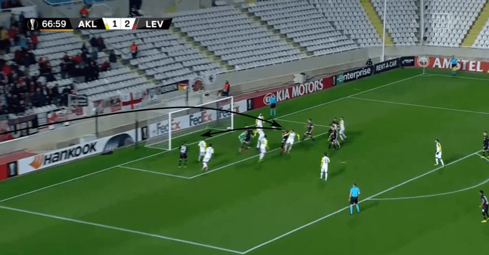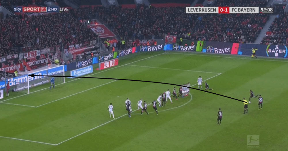 The Jamaican crosses on average 5.22 times per game, and not every single one of them is high since Leverkusen’s usual single striker, Kevin Volland, isn’t a specialist when it comes to aerial duels.