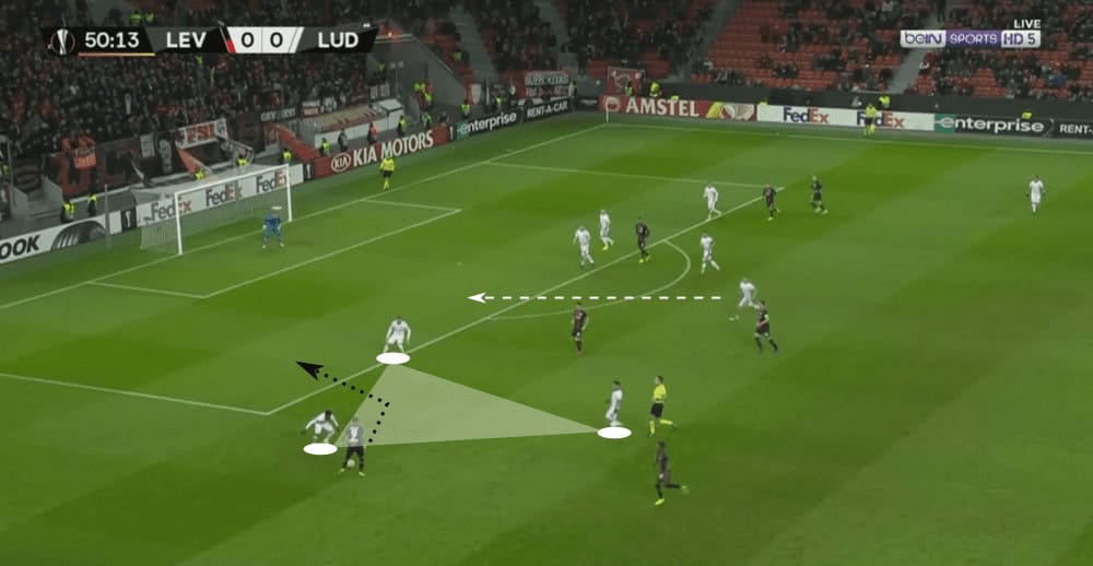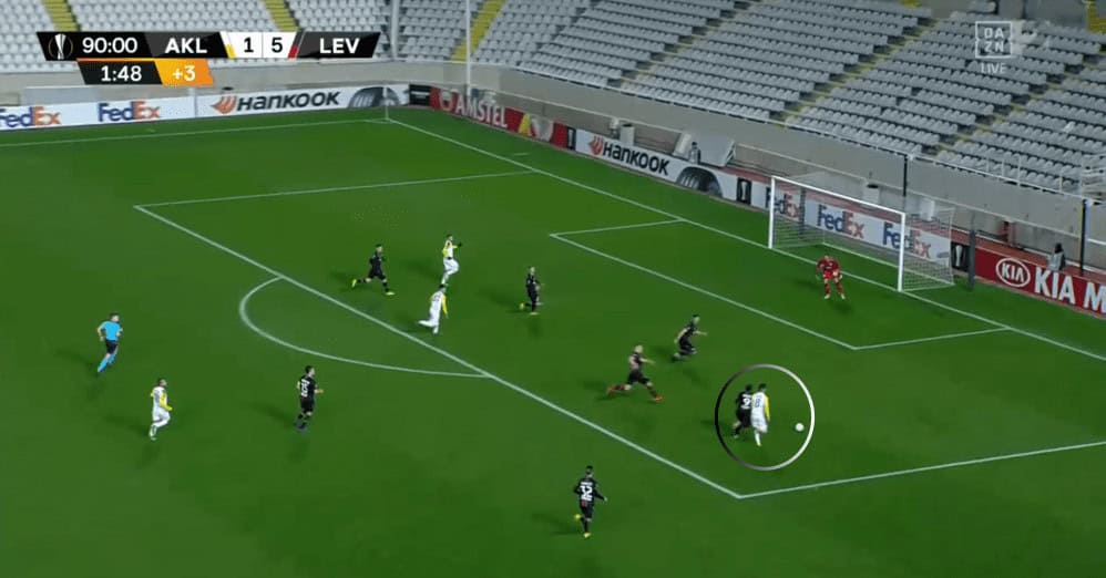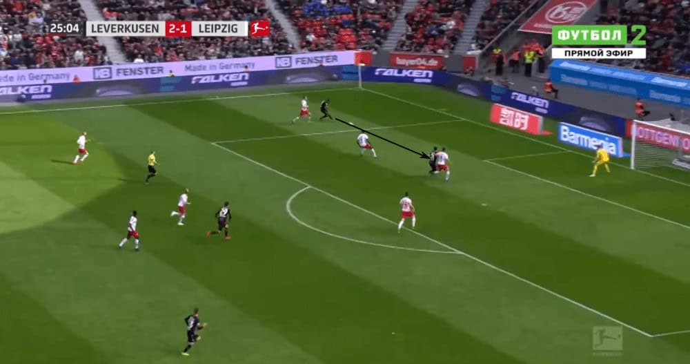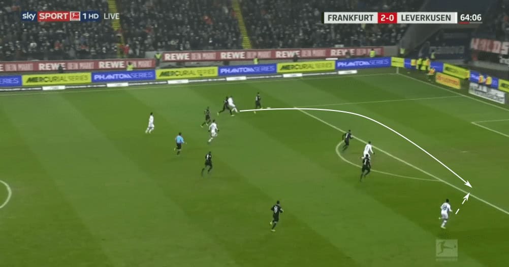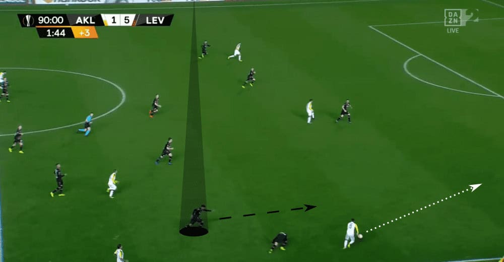 Especially then, the distance between Leverkusen’s winger and the opponent’s full-back gets bigger, and so Bailey can pick up a lot of speed when he receives the ball.